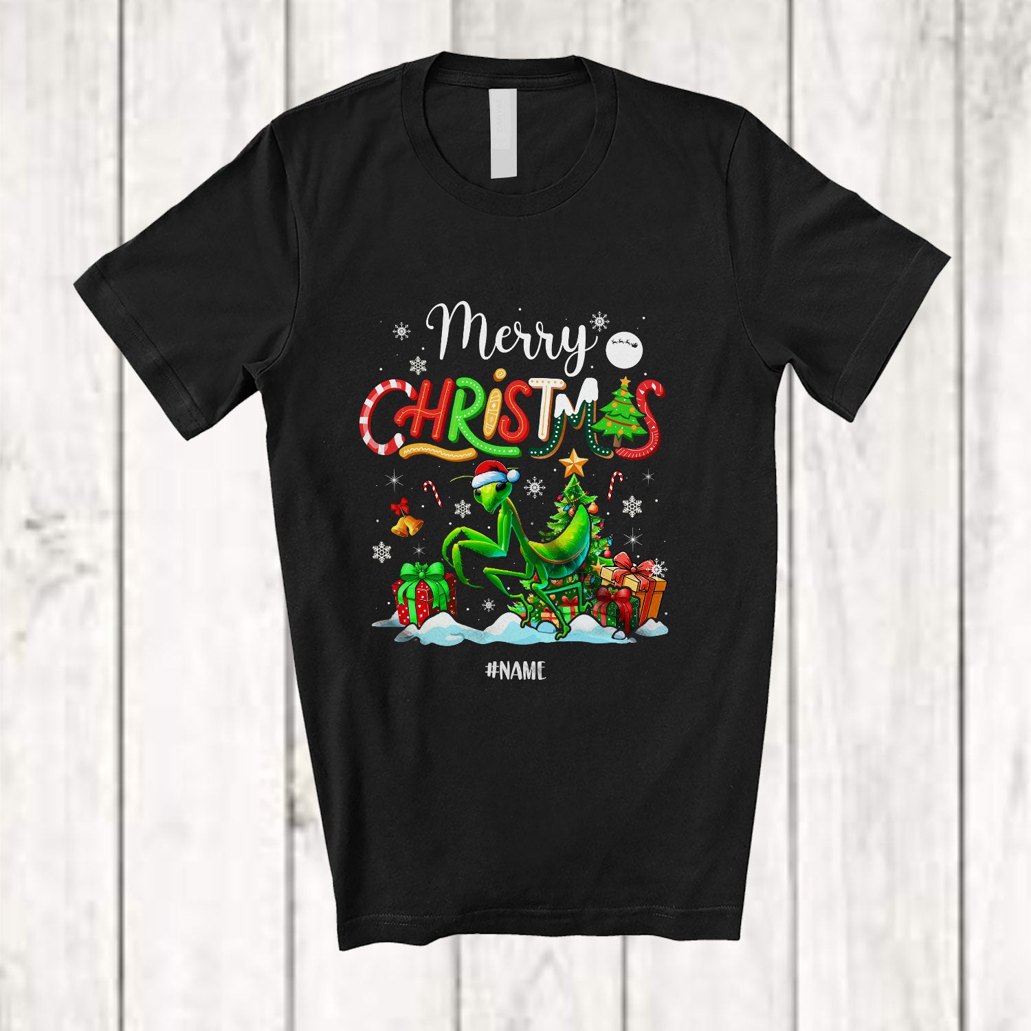 Personalized Custom Name Merry Christmas; Lovely X-mas Tree Snowing Santa Mantis Animal T-Shirt. This cotton t-shirt is a durable staple product with a classic fit. One of the most popular items, it has a relaxed style made for everyday and casual wear.