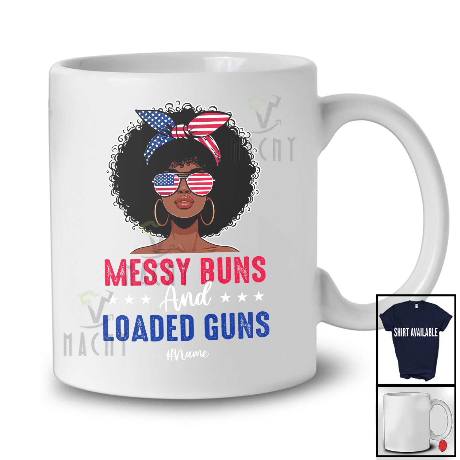 • Personalized Custom Name Messy Buns And Loaded Guns; Proud 4th Of July Afro Girl; Patriotic T-Shirt. This cotton t-shirt is a durable staple product with a classic fit. One of the most popular items, it has a relaxed style made for everyday and casual wear.