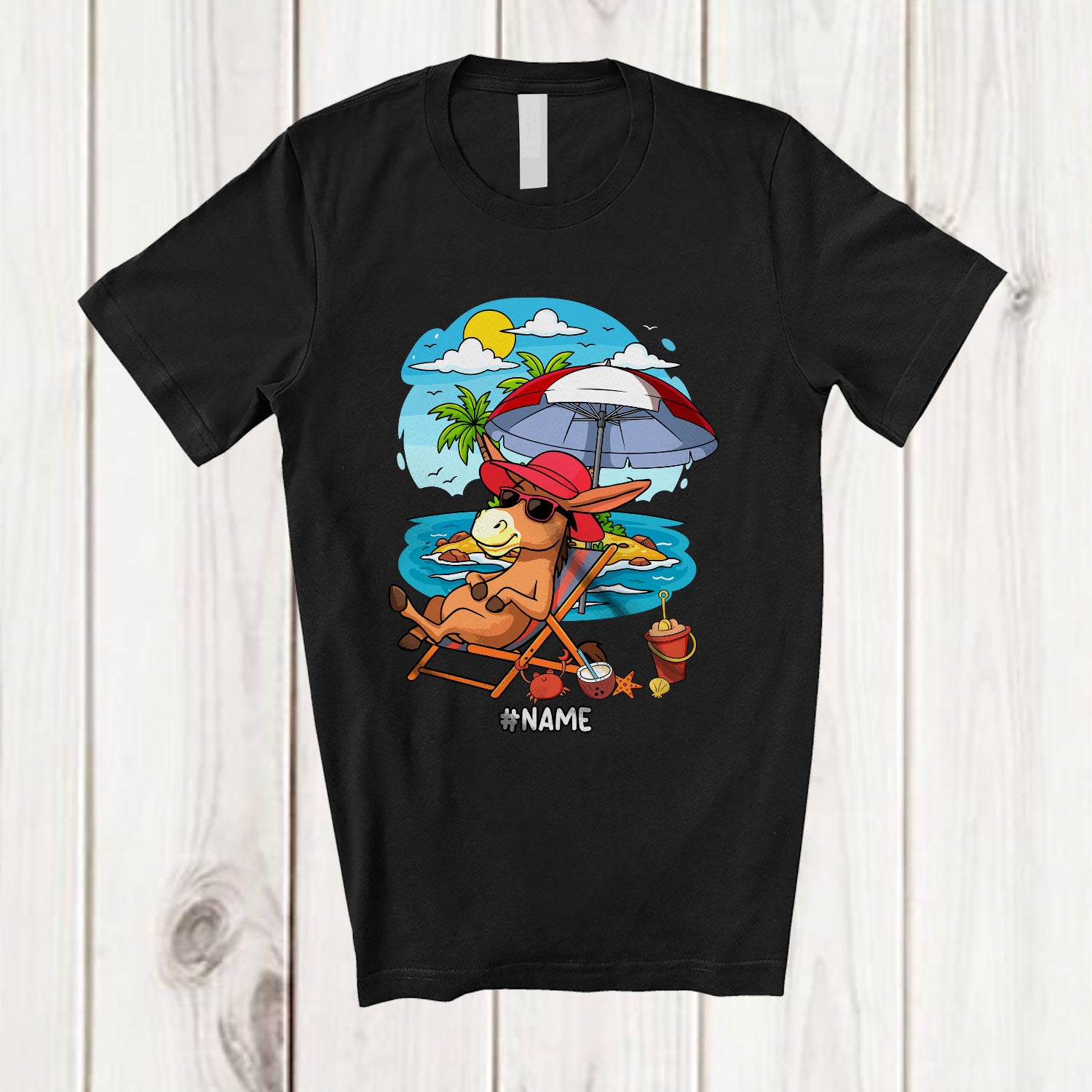 • Personalized Custom Name Mule On Beach; Lovely Summer Vacation Palm Tree; Hawaiian Family T-Shirt. This cotton t-shirt is a durable staple product with a classic fit. One of the most popular items, it has a relaxed style made for everyday and casual wear.