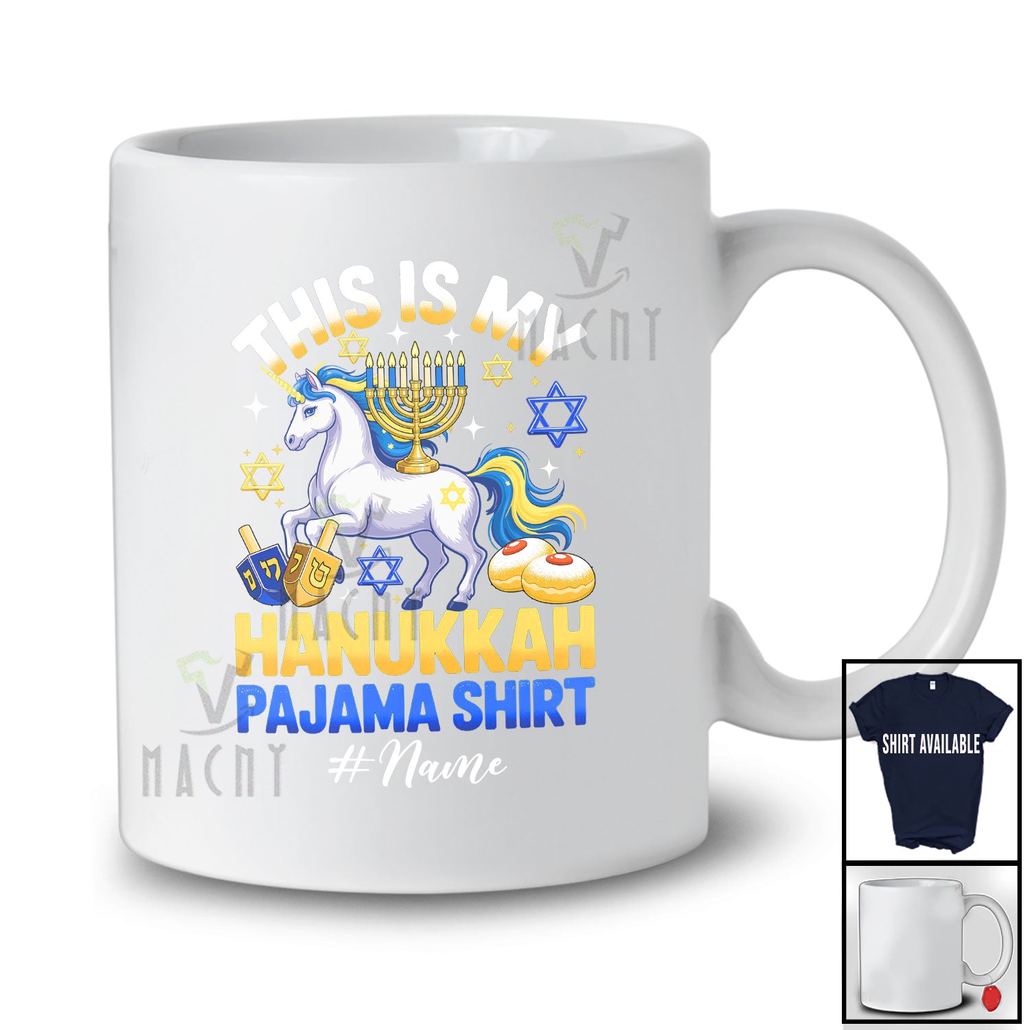 Personalized Custom Name My Hanukkah Pajama Shirt; Lovely Chanukah Lights Unicorn T-Shirt. This cotton t-shirt is a durable staple product with a classic fit. One of the most popular items, it has a relaxed style made for everyday and casual wear.