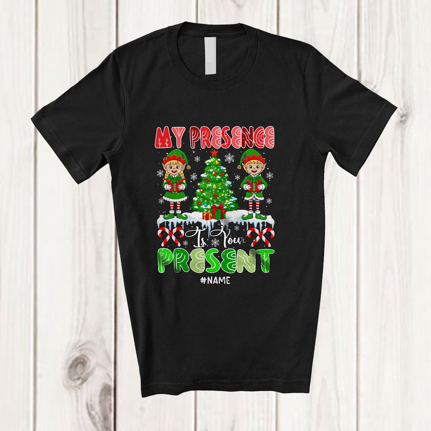 Personalized Custom Name My Presence Is Your Present; Awesome Christmas Tree Elf T-Shirt. This cotton t-shirt is a durable staple product with a classic fit. One of the most popular items, it has a relaxed style made for everyday and casual wear.