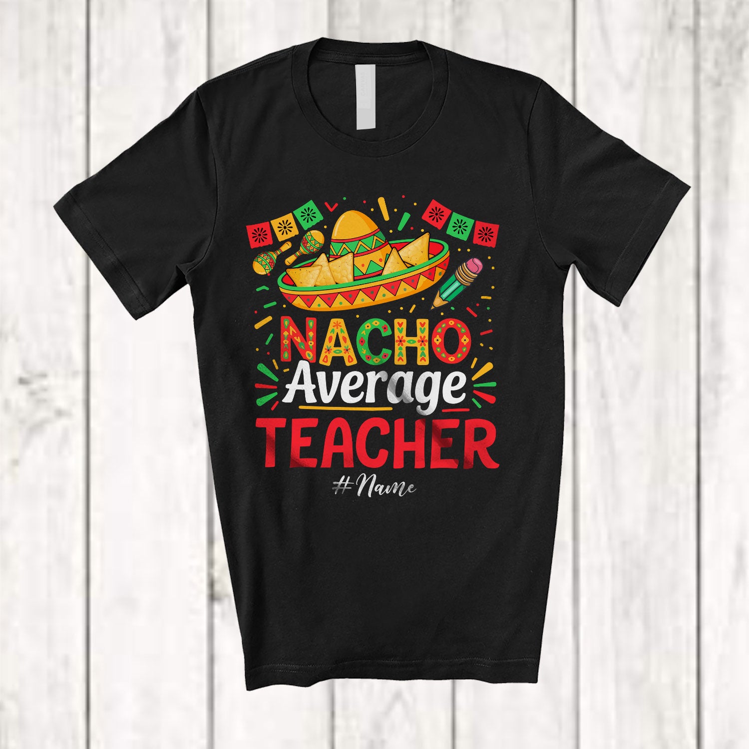 Personalized Custom Name Nacho Average Teacher; Proud Cinco De Mayo Mexican Sombrero T-Shirt. This cotton t-shirt is a durable staple product with a classic fit. One of the most popular items, it has a relaxed style made for everyday and casual wear.
