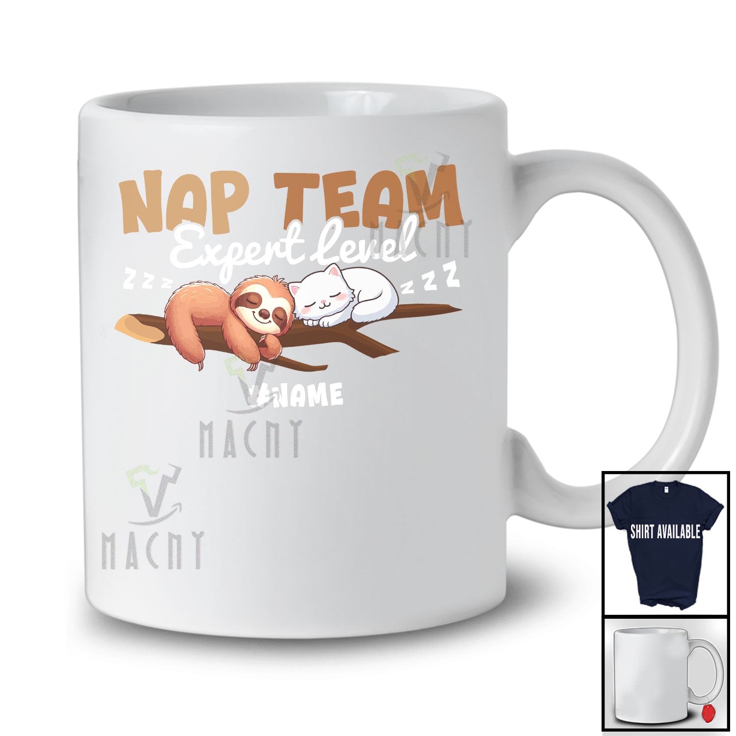 Personalized Custom Name Nap Team Expert Level; Lovely Kawaii Cat And Sloth Sleeping T-Shirt. This cotton t-shirt is a durable staple product with a classic fit. One of the most popular items, it has a relaxed style made for everyday and casual wear.