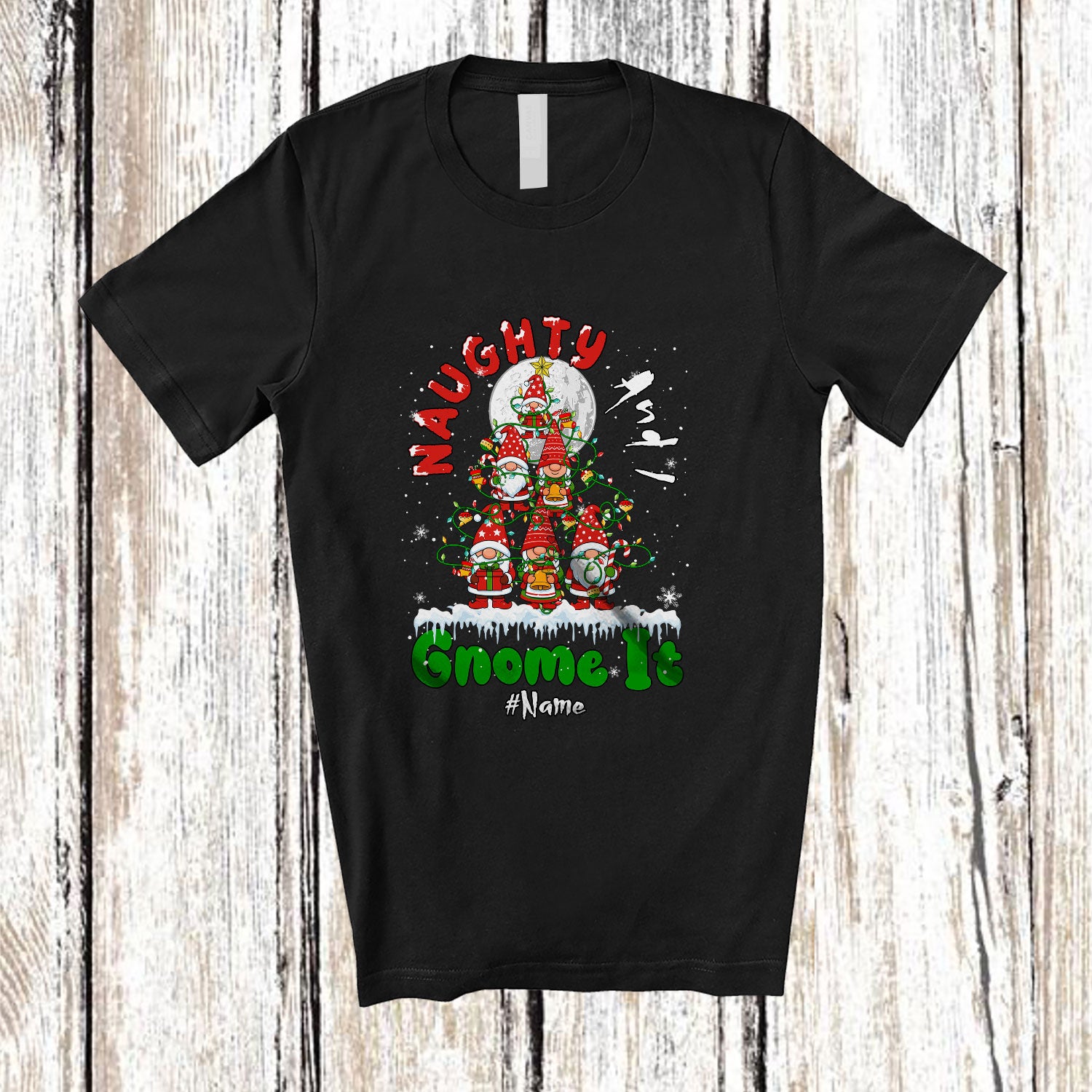 Personalized Custom Name Naughty And I Gnome It; Joyful Christmas Tree Gnomies; Family T-Shirt. This cotton t-shirt is a durable staple product with a classic fit. One of the most popular items, it has a relaxed style made for everyday and casual wear.
