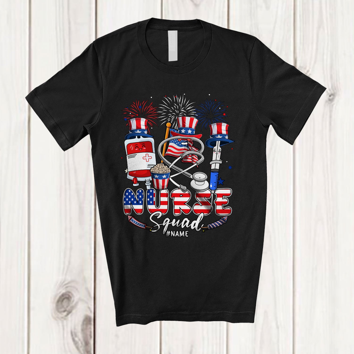 Personalized Custom Name Nurse Squad; Proud 4th Of July Three Nurse Nursing Tools; Patriotic T-Shirt