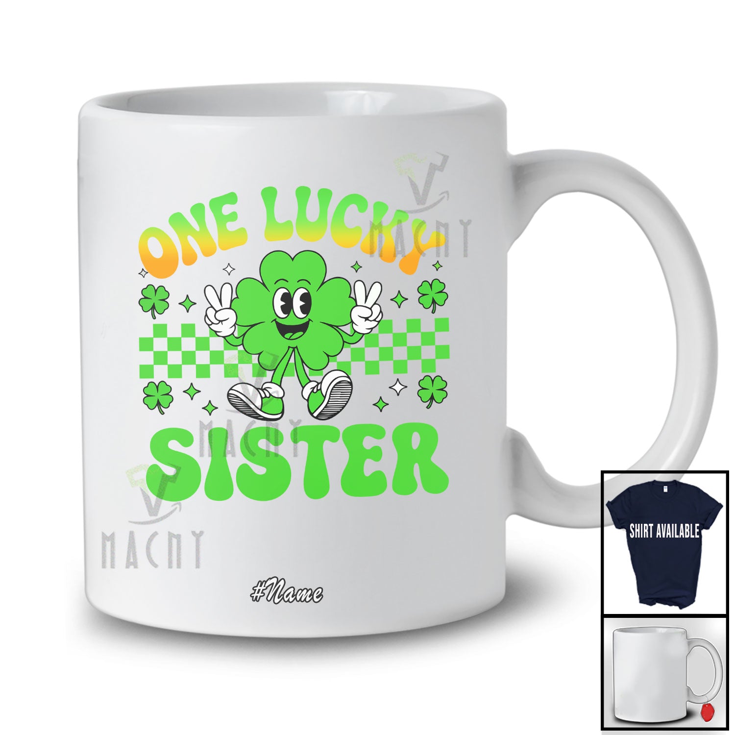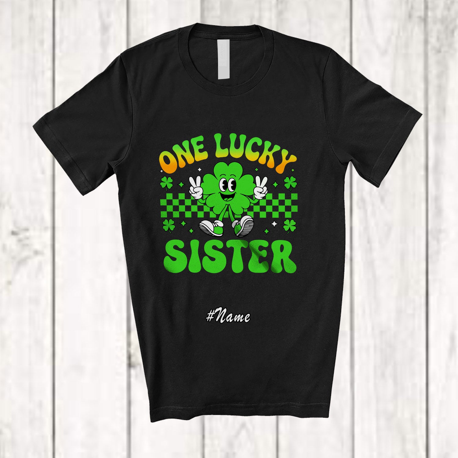 Personalized Custom Name One Lucky Sister; Amusing St. Patrick's Day Shamrock Irish Family T-Shirt. This cotton t-shirt is a durable staple product with a classic fit. One of the most popular items, it has a relaxed style made for everyday and casual wear.