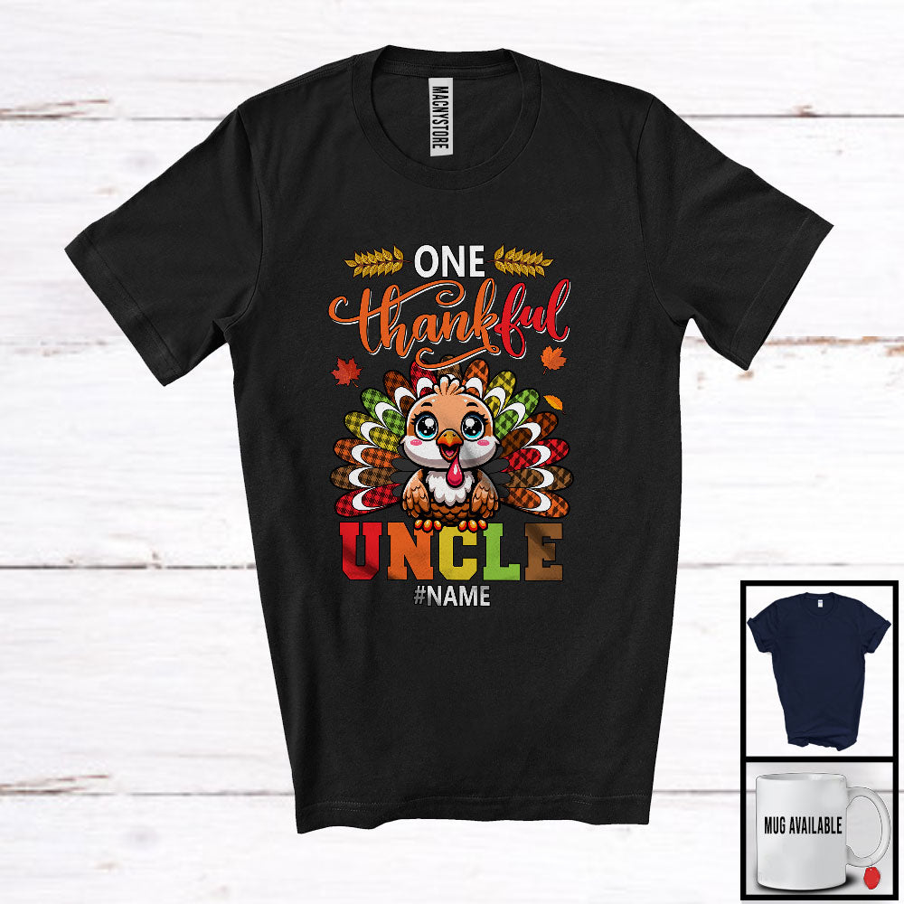 Personalized Custom Name One Thankful Uncle; Amusing Thanksgiving Turkey Plaid Tail; Family T-Shirt. This cotton t-shirt is a durable staple product with a classic fit. One of the most popular items, it has a relaxed style made for everyday and casual wear.
