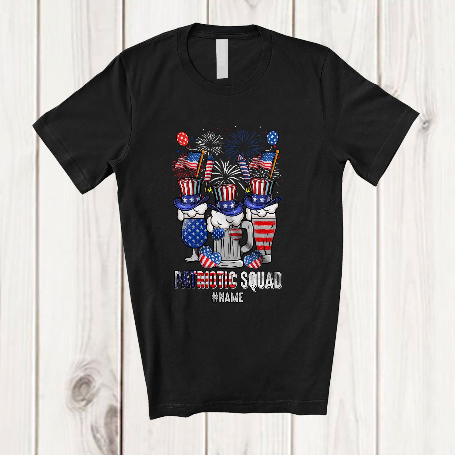Personalized Custom Name Patriotic Squad; Amazing 4th Of July Three Beer Glasses; Drinking T-Shirt. This cotton t-shirt is a durable staple product with a classic fit. One of the most popular items, it has a relaxed style made for everyday and casual wear.