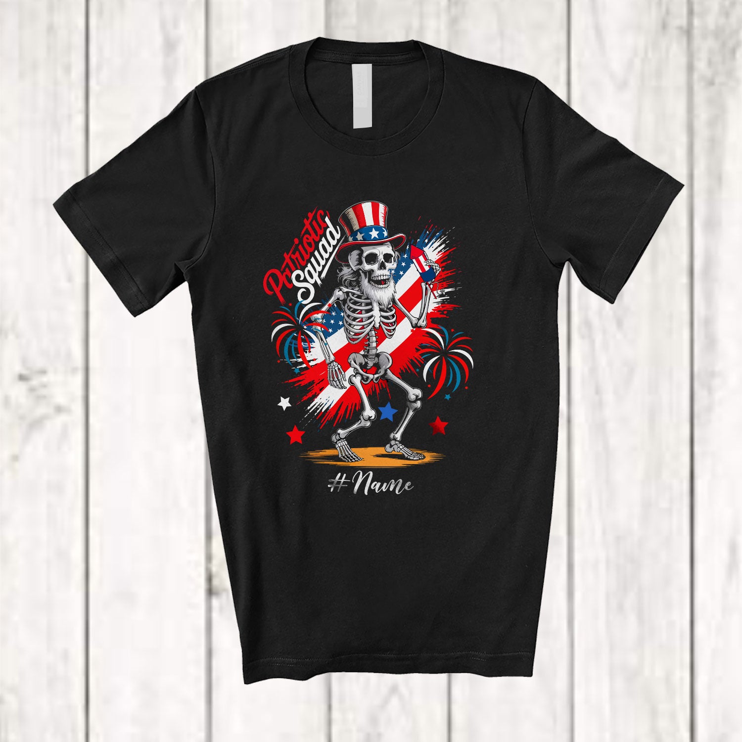 • Personalized Custom Name Patriotic Squad; Awesome 4th Of July Skeleton American Flag Firecracker T-Shirt. This cotton t-shirt is a durable staple product with a classic fit. One of the most popular items, it has a relaxed style made for everyday and casual wear.