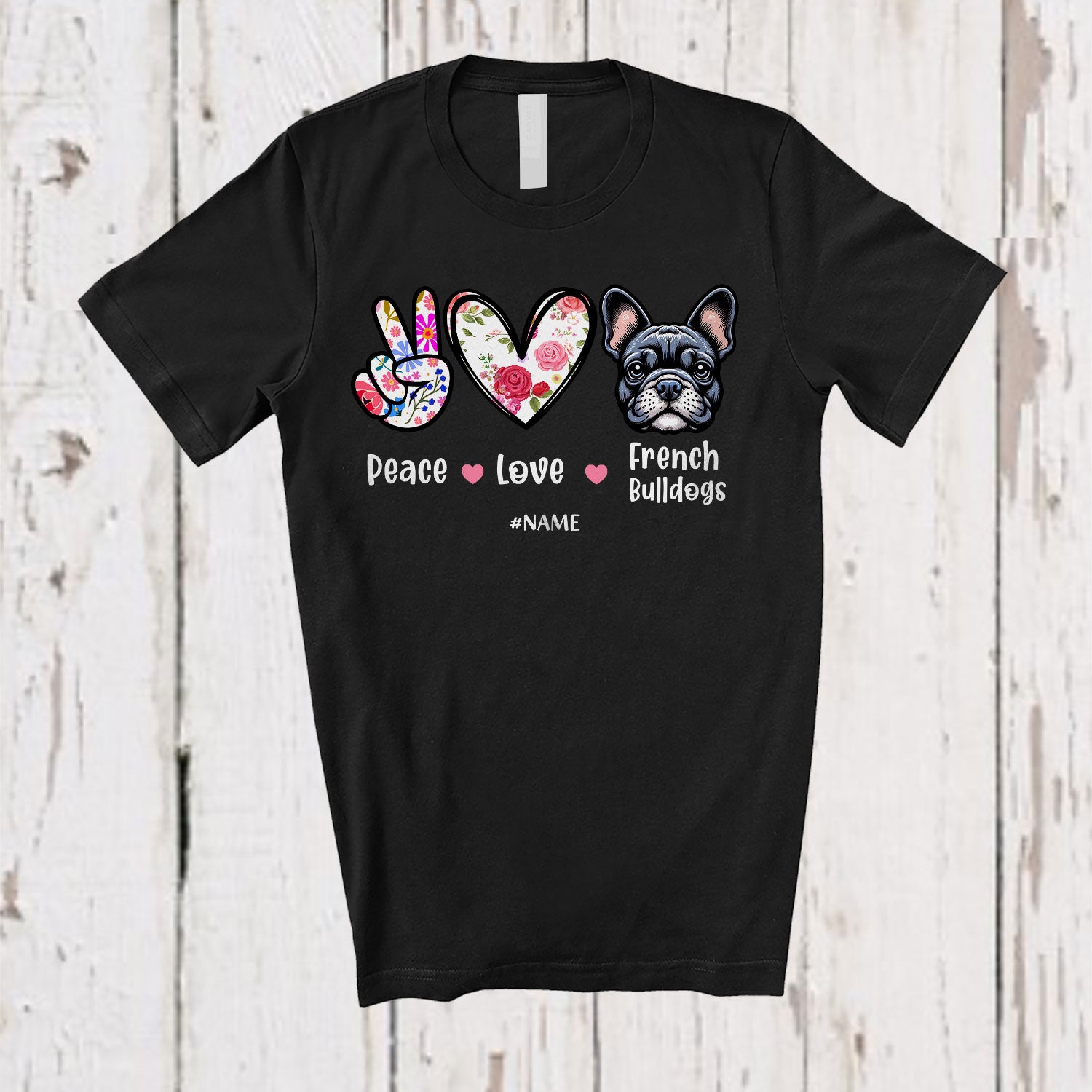 Personalized Custom Name Peace Love French Bulldogs; Floral Mother's Day Hand Sign Heart T-Shirt