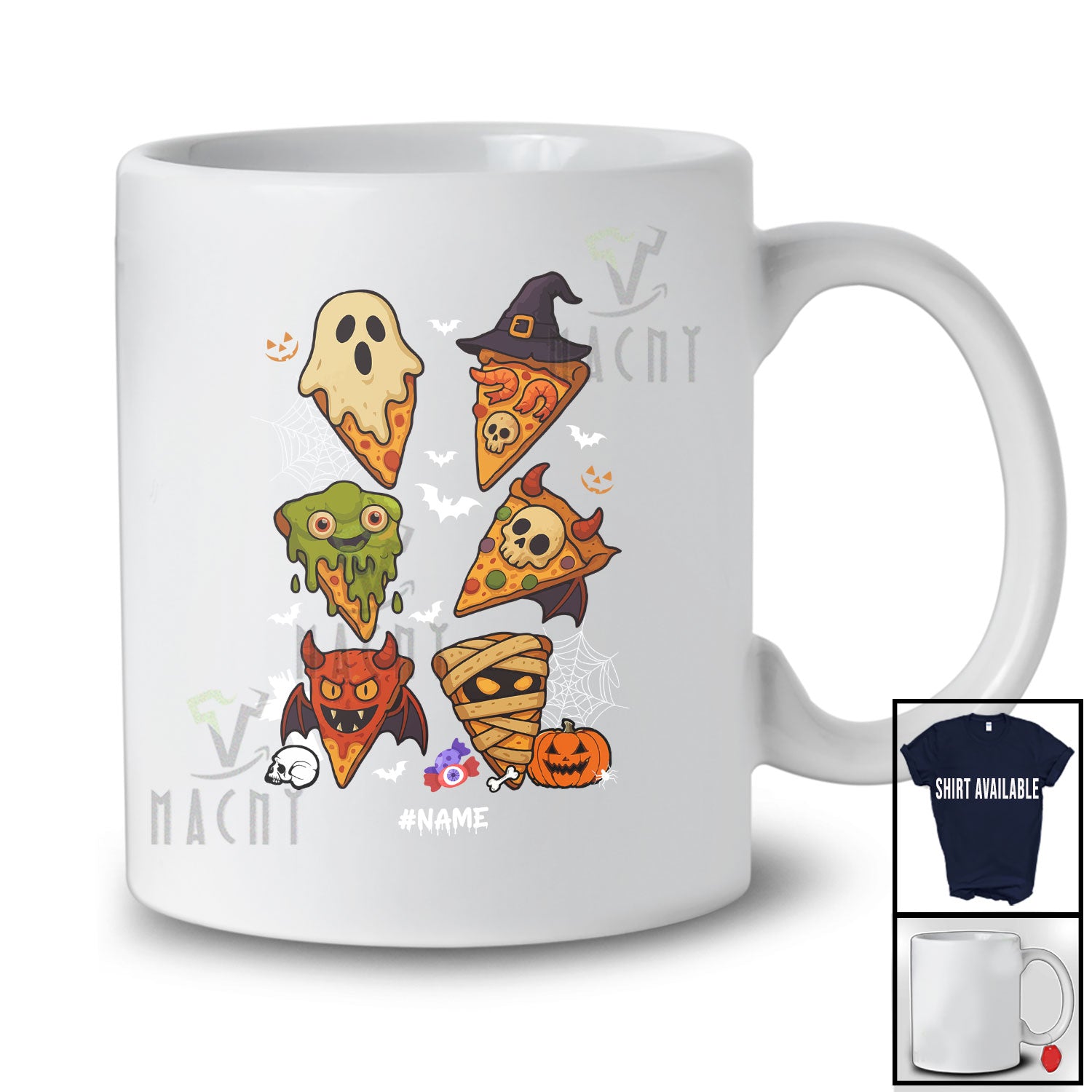 Personalized Custom Name Pizza Witch Zombie Mummy; Horror Halloween Collection Food T-Shirt. This cotton t-shirt is a durable staple product with a classic fit. One of the most popular items, it has a relaxed style made for everyday and casual wear.