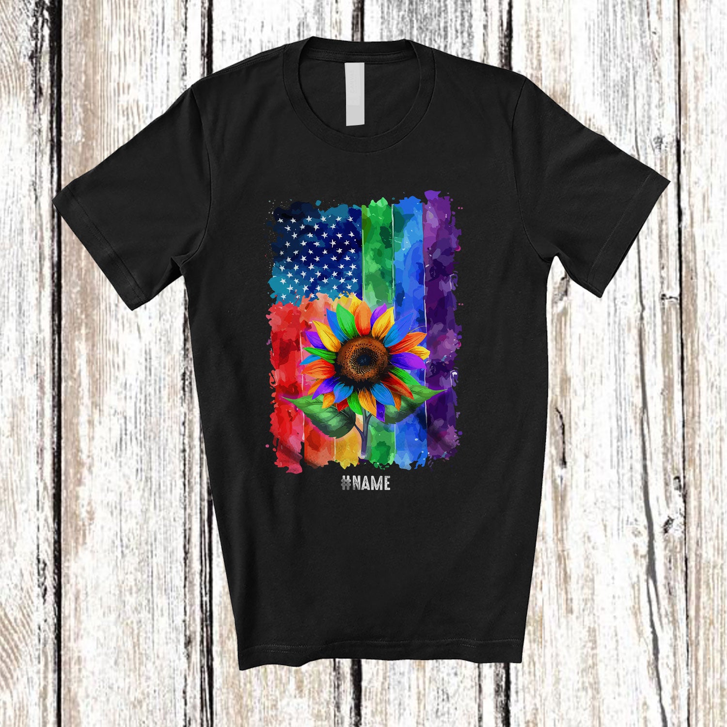 Personalized Custom Name Rainbow American Flag Sunflower; Colorful LGBTQ 4th of July Patriotic T-Shirt