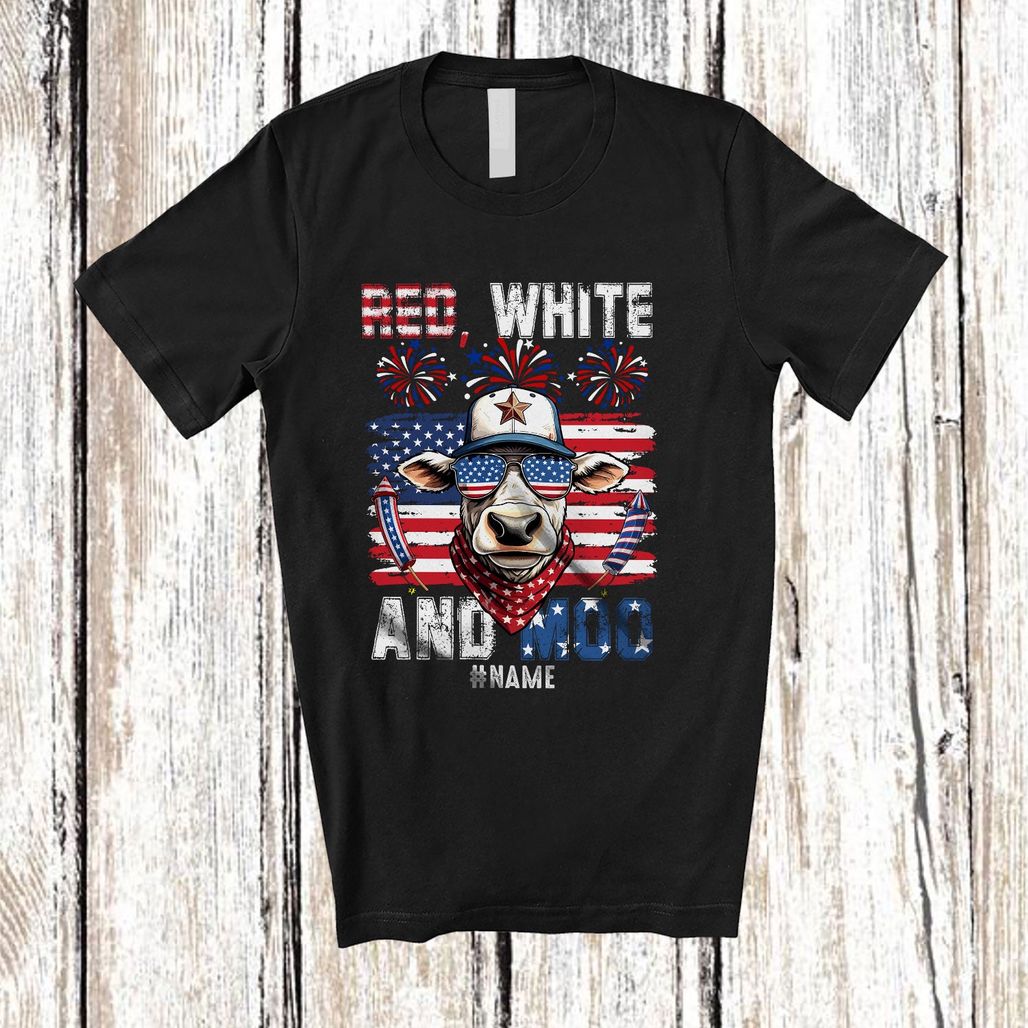 Personalized Custom Name Red White and Moo; Wonderful 4th Of July Cow US Flag; Farmer Patriotic T-Shirt