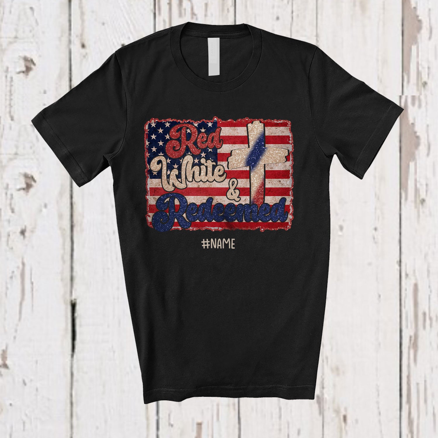 Personalized Custom Name Red White and Redeemed; Humorous 4th of July Jesus US Flag Patriotic T-Shirt