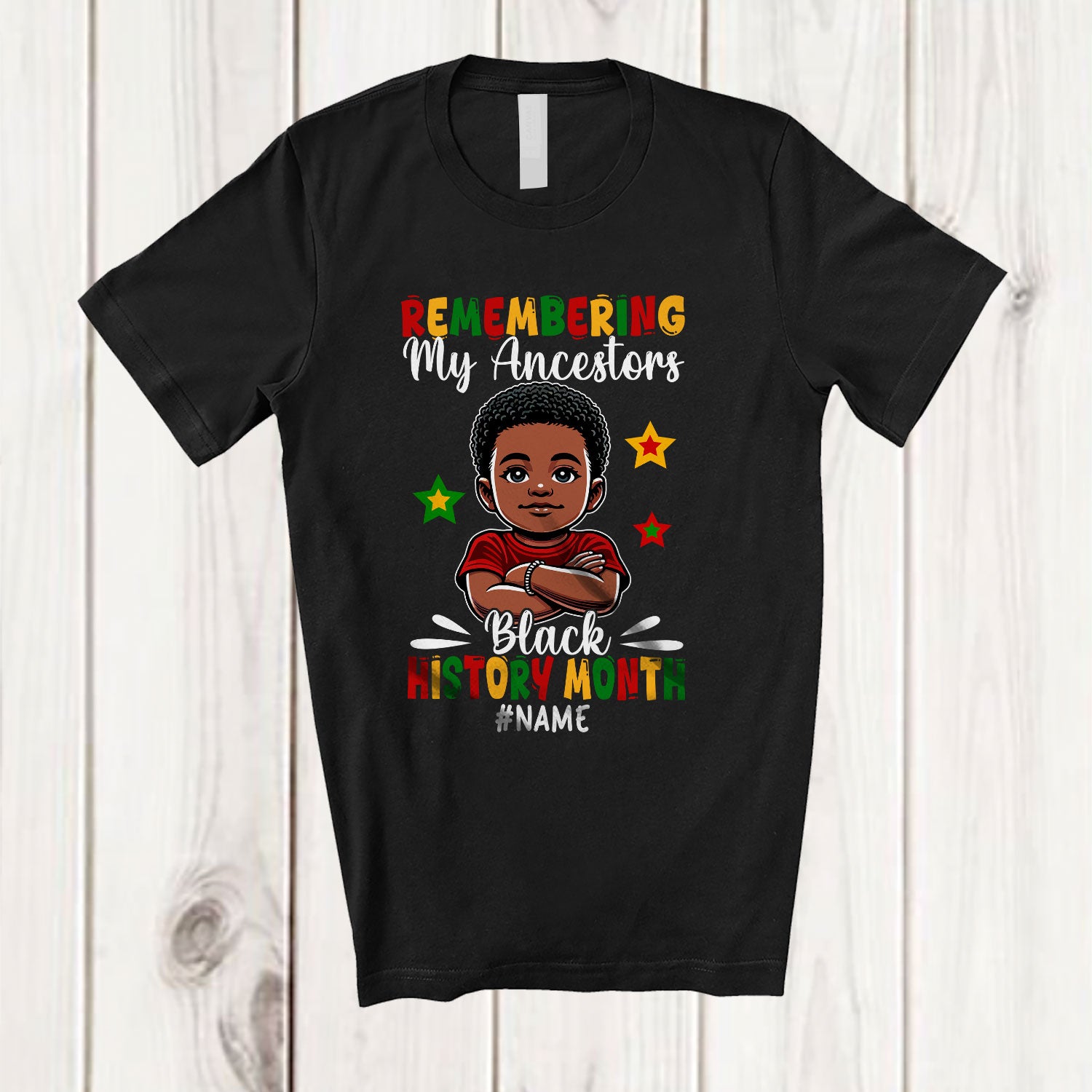 • Personalized Custom Name Remembering My Ancestors; Lovely Black History Month Boys Afro T-Shirt. This cotton t-shirt is a durable staple product with a classic fit. One of the most popular items, it has a relaxed style made for everyday and casual wear.