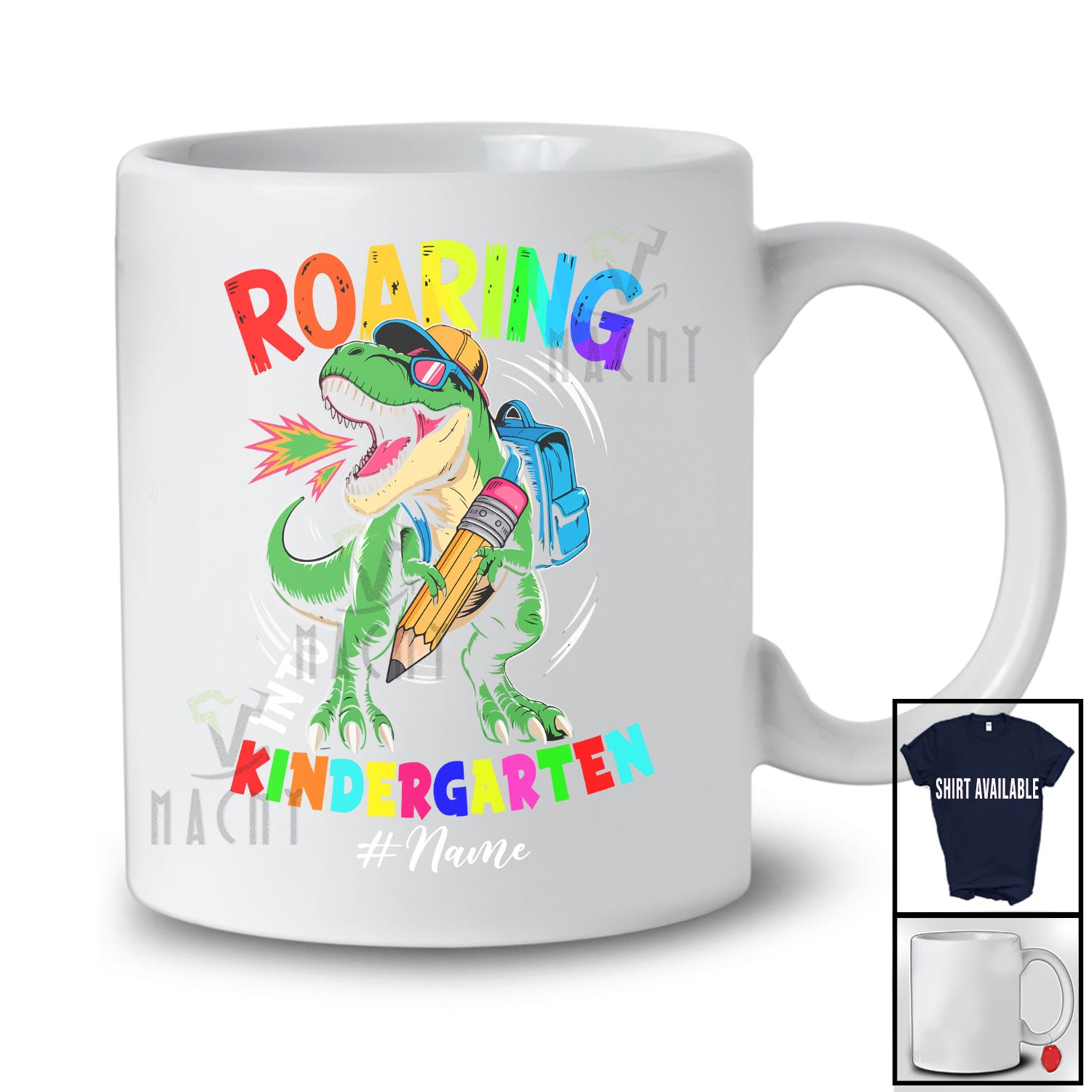 Personalized Custom Name Roaring Into Kindergarten; Joyful Back To School First Day T-Rex T-Shirt. This cotton t-shirt is a durable staple product with a classic fit. One of the most popular items, it has a relaxed style made for everyday and casual wear.