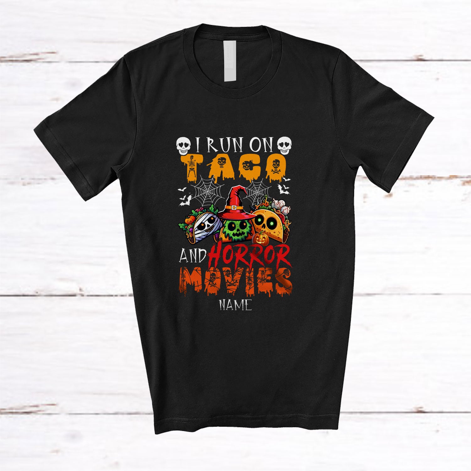 Personalized Custom Name Run On Taco Horror Movies; Creepy Halloween Three Tacos Food T-Shirt