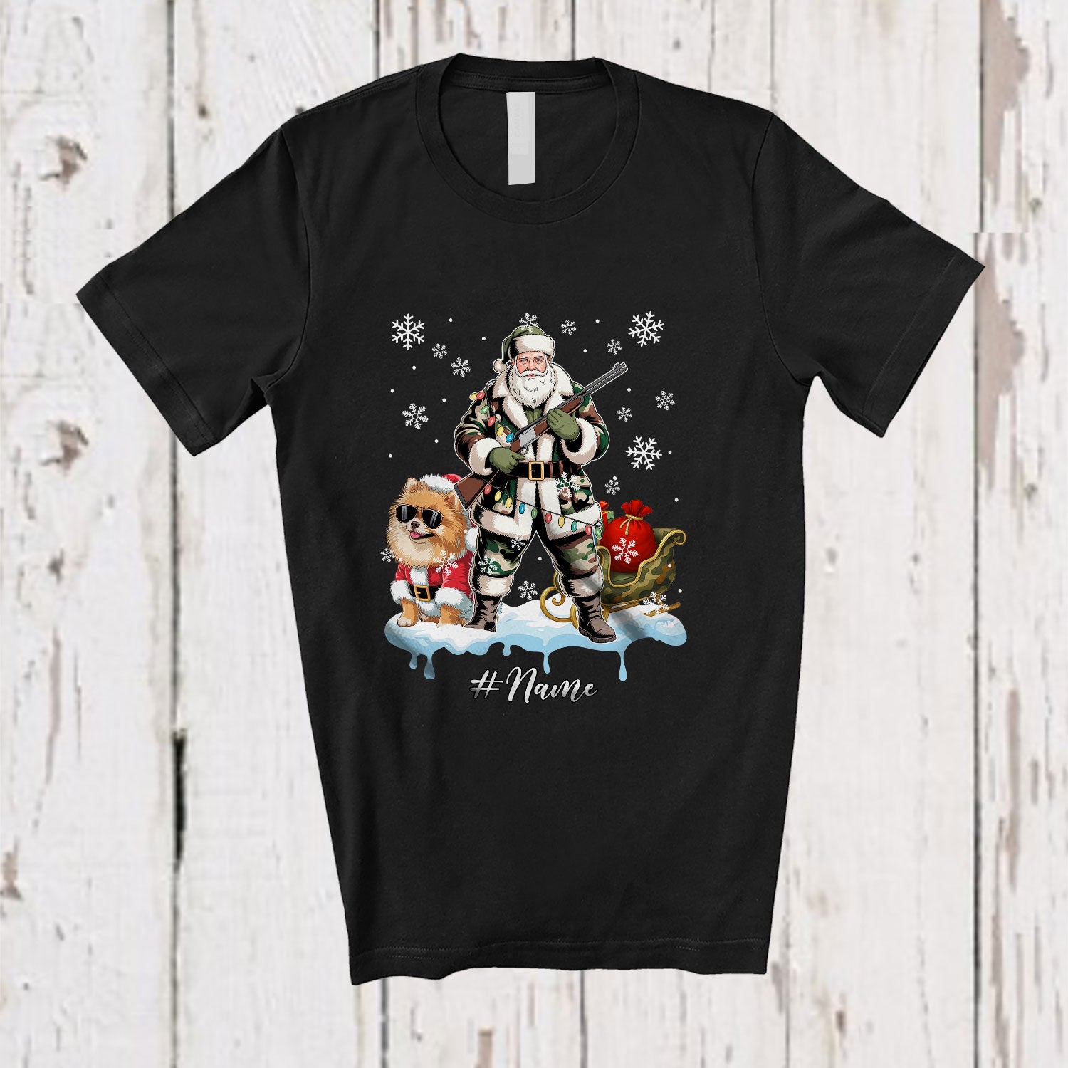 Personalized Custom Name Santa Go Hunting Pomeranian; Awesome Christmas Lights Hunter T-Shirt. This cotton t-shirt is a durable staple product with a classic fit. One of the most popular items, it has a relaxed style made for everyday and casual wear.