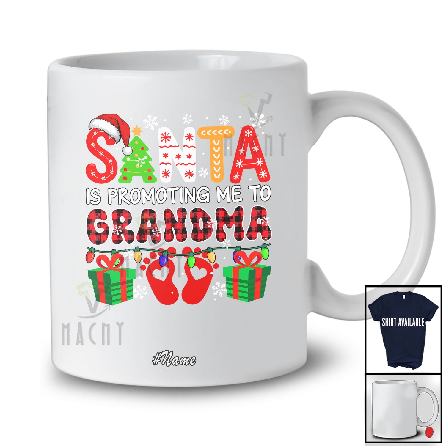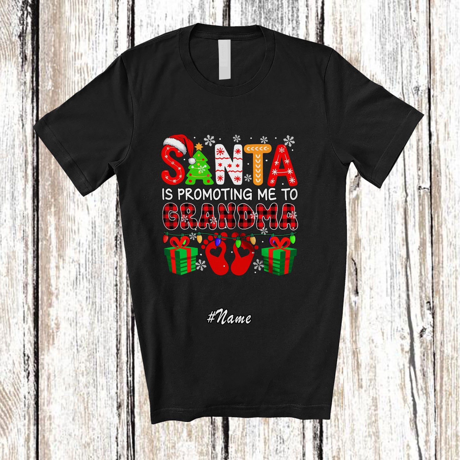 • Personalized Custom Name Santa Promoting Me To Grandma; Merry Christmas Pregnancy Family T-Shirt. This cotton t-shirt is a durable staple product with a classic fit. One of the most popular items, it has a relaxed style made for everyday and casual wear.
