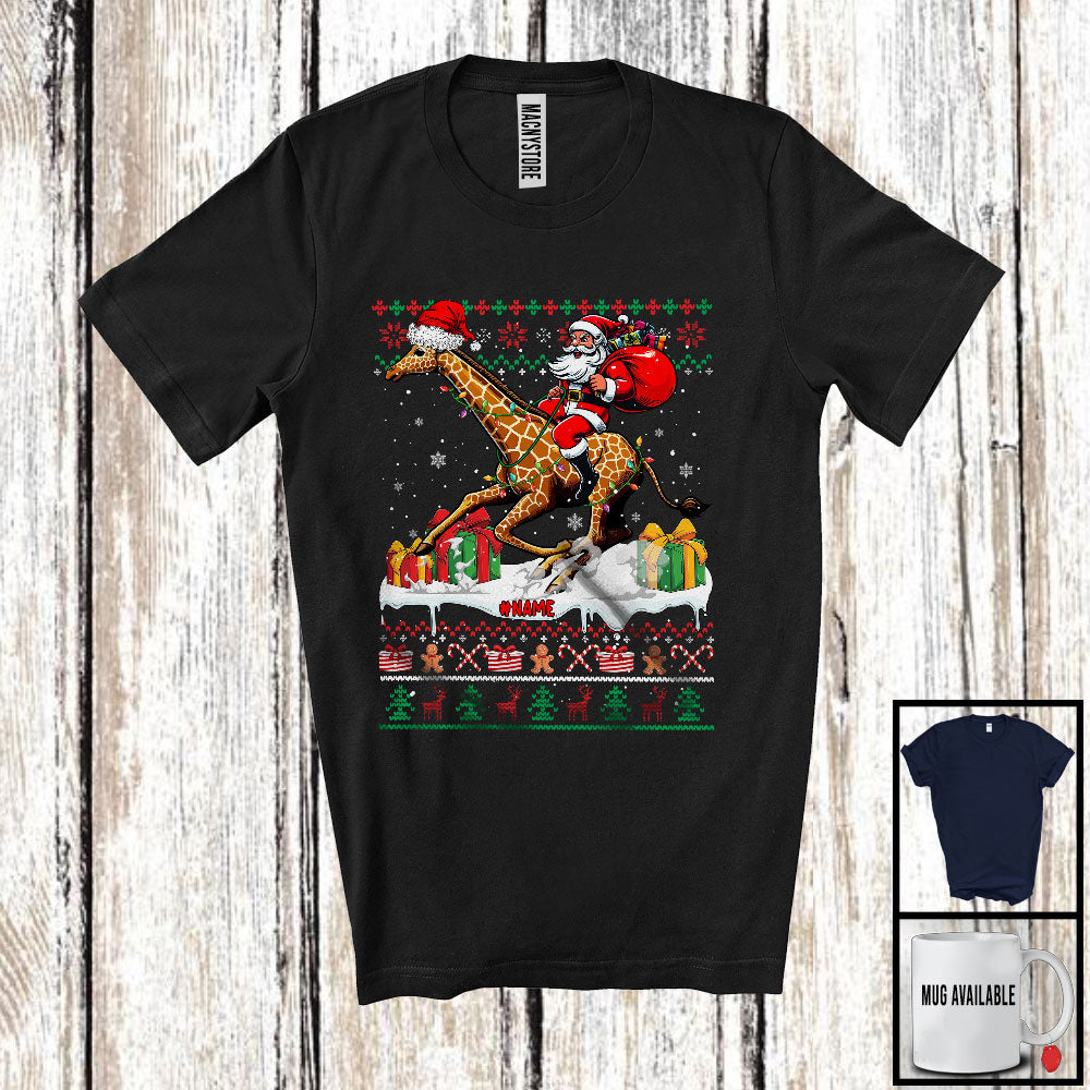 Personalized Custom Name Santa Riding Giraffe; Lovely Christmas Lights Sweater Santa Giraffe Lover T-Shirt