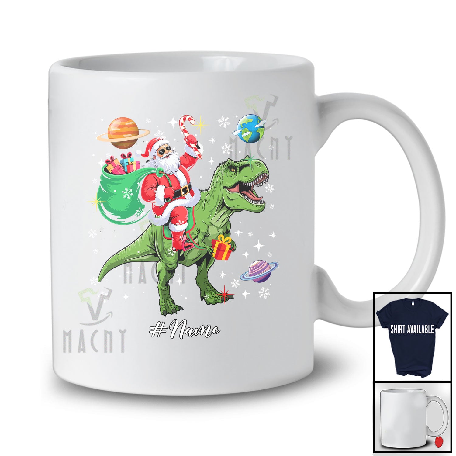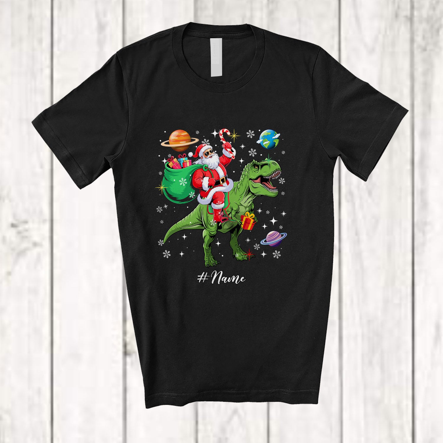 Personalized Custom Name Santa Riding T-Rex; Awesome Christmas Santa In Space Galaxy T-Shirt. This cotton t-shirt is a durable staple product with a classic fit. One of the most popular items, it has a relaxed style made for everyday and casual wear.
