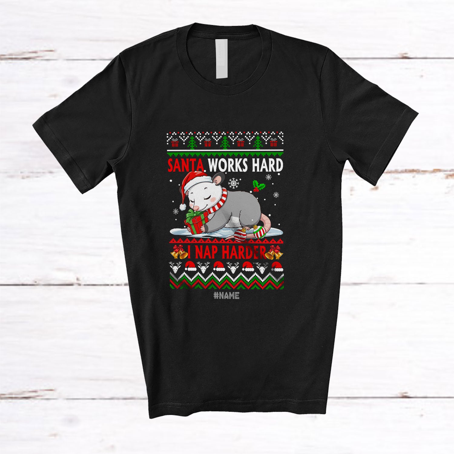 • Personalized Custom Name Santa Works Hard Nap Harder; Lovely Christmas Sweater Opossum Sleeping T-Shirt. This cotton t-shirt is a durable staple product with a classic fit. One of the most popular items, it has a relaxed style made for everyday and casual wear.