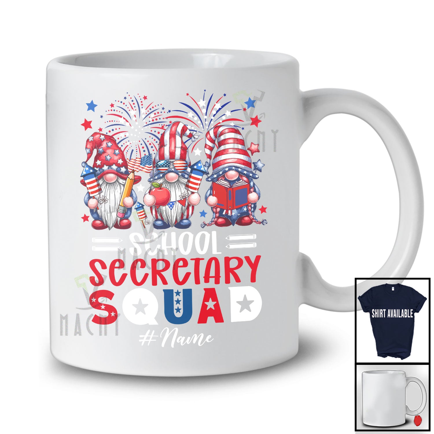 Personalized Custom Name School Secretary Squad; Adorable 4th Of July Three Patriotic Gnomes T-Shirt. This cotton t-shirt is a durable staple product with a classic fit. One of the most popular items, it has a relaxed style made for everyday and casual wear.