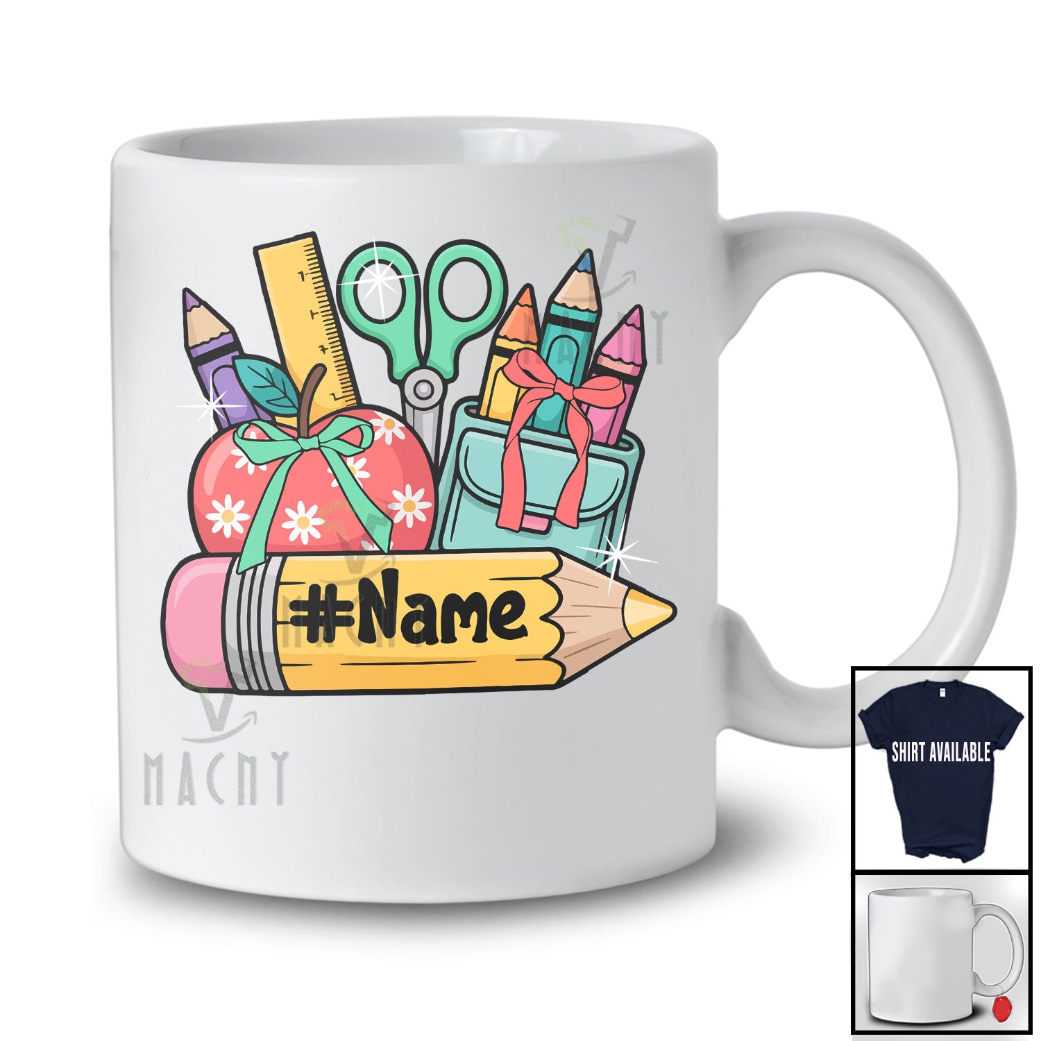 • Personalized Custom Name School Tools; Adorable Back to School First Day Students Teacher T-Shirt. This cotton t-shirt is a durable staple product with a classic fit. One of the most popular items, it has a relaxed style made for everyday and casual wear.