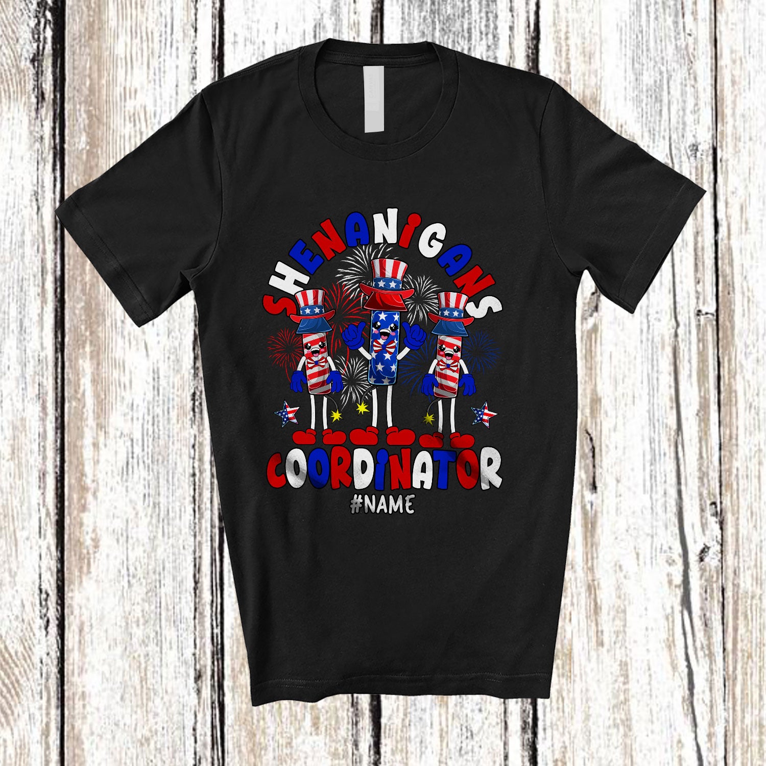 Personalized Custom Name Shenanigans Coordinator; Proud 4th Of July Three Firecrackers Fireworks T-Shirt. This cotton t-shirt is a durable staple product with a classic fit. One of the most popular items, it has a relaxed style made for everyday and casual wear.