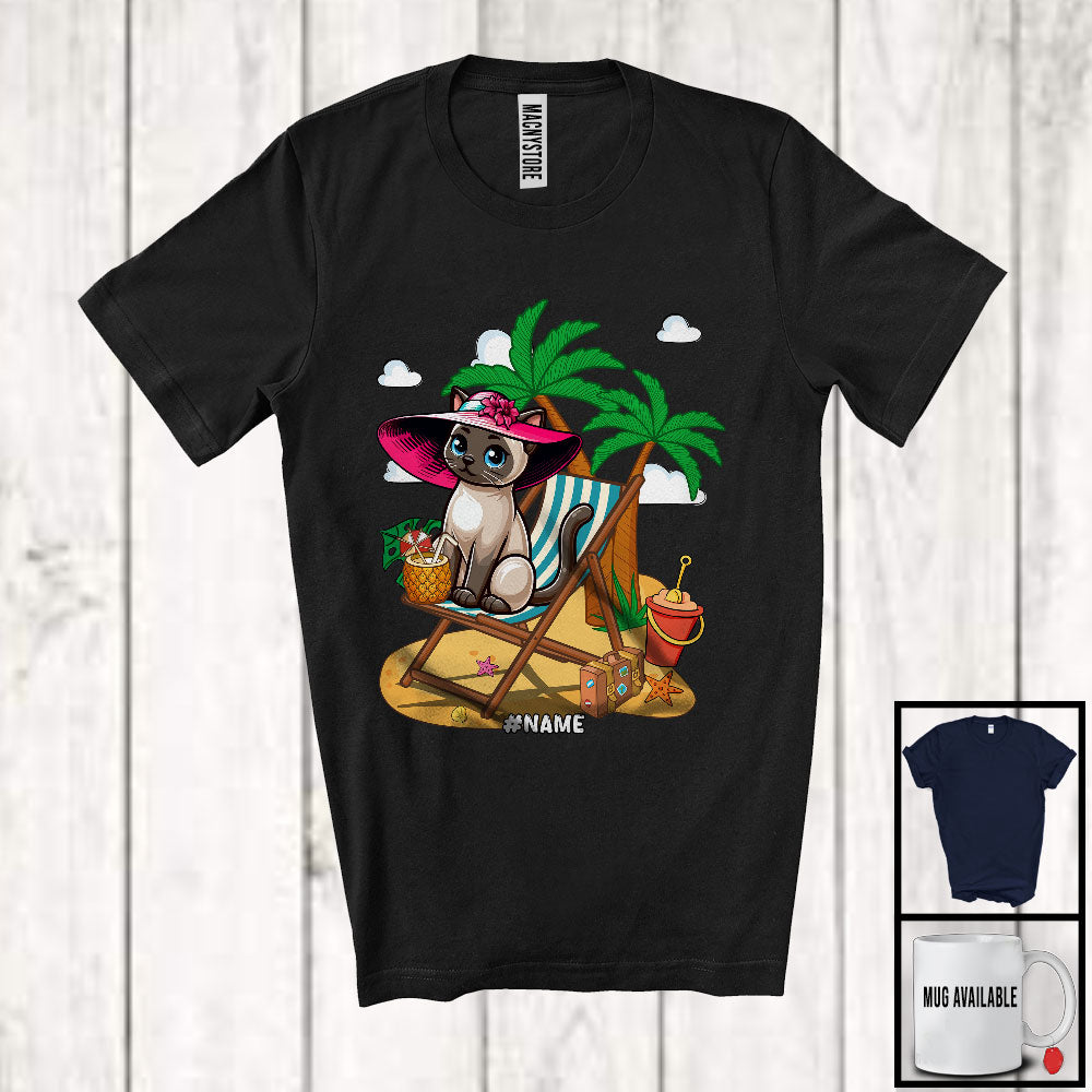 new MacnyStore - Personalized Custom Name Siamese Cat On Beach, Lovely Summer Vacation Kitten Palm Tree T-Shirt – Macnystore