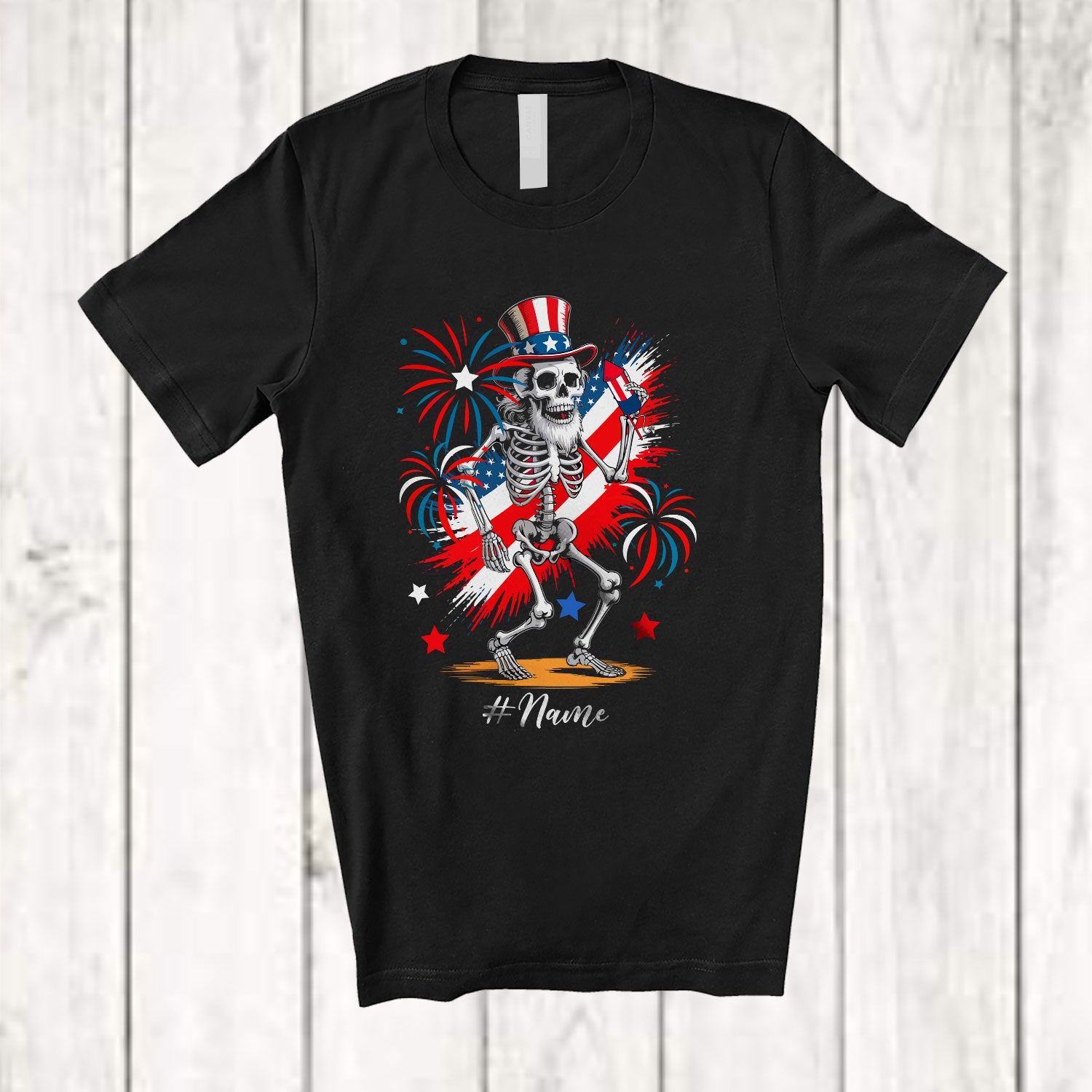• Personalized Custom Name Skeleton American Flag Hat; Awesome 4th Of July US Flag Patriotic T-Shirt. This cotton t-shirt is a durable staple product with a classic fit. One of the most popular items, it has a relaxed style made for everyday and casual wear.
