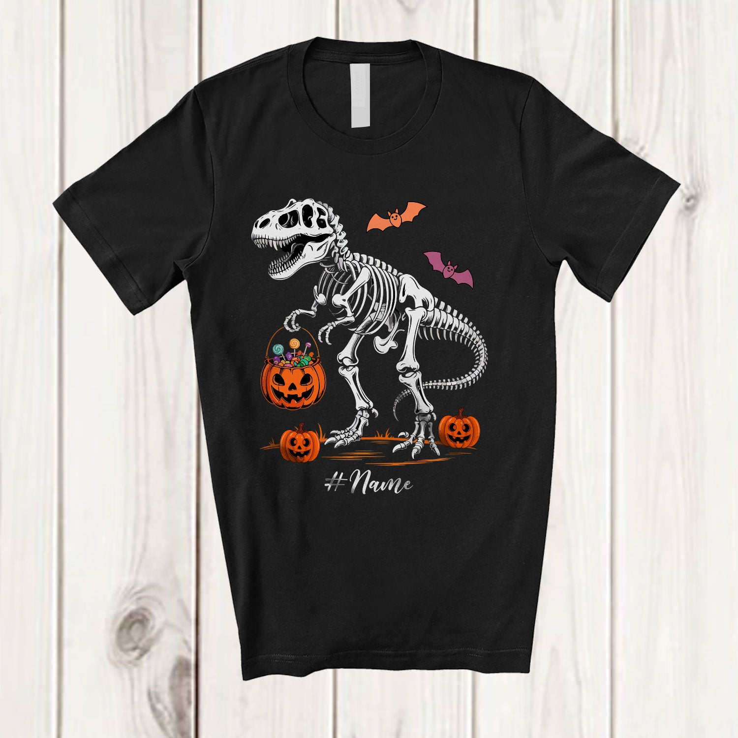 Personalized Custom Name Skeleton T-Rex; Creepy Halloween Pumpkin Candy; Boys Family T-Shirt