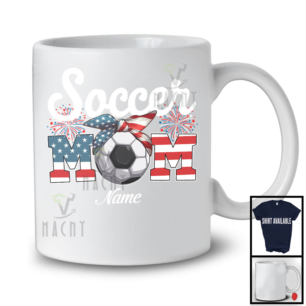 Personalized Custom Name Soccer Mom, Proud 4th Of July USA Flag Headband, Patriotic Family T-Shirt. This cotton t-shirt is a durable staple product with a classic fit. One of the most popular items, it has a relaxed style made for everyday and casual wear.