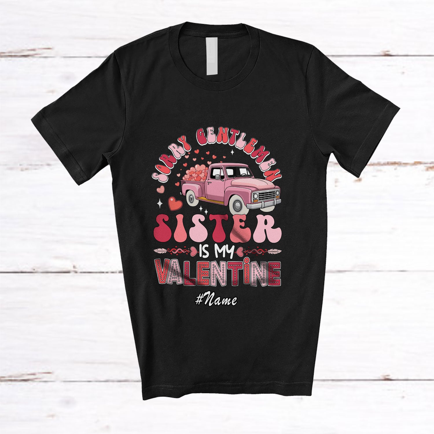 • Personalized Custom Name Sorry Gentlemen Sister Is My Valentine; Joyful Hearts On Pickup Truck T-Shirt. This cotton t-shirt is a durable staple product with a classic fit. One of the most popular items, it has a relaxed style made for everyday and casual wear.