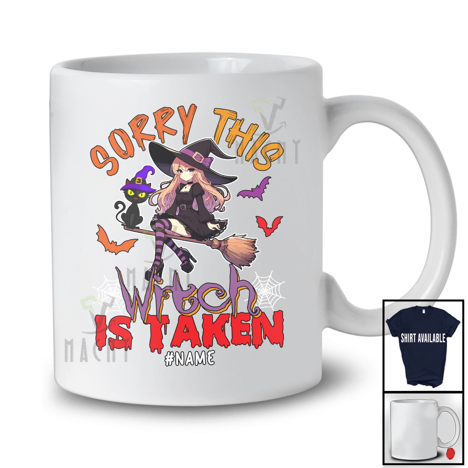 Personalized Custom Name Sorry This Witch Is Taken; Lovely Halloween Witch Cat Broomstick T-Shirt. This cotton t-shirt is a durable staple product with a classic fit. One of the most popular items, it has a relaxed style made for everyday and casual wear.