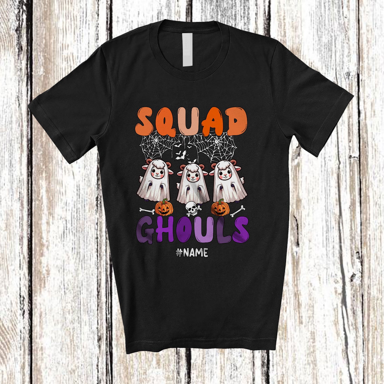 • Personalized Custom Name Squad Ghouls; Lovely Halloween Three Sheep Boo Ghost Cosplay; Farmer T-Shirt. This cotton t-shirt is a durable staple product with a classic fit. One of the most popular items, it has a relaxed style made for everyday and casual wear.