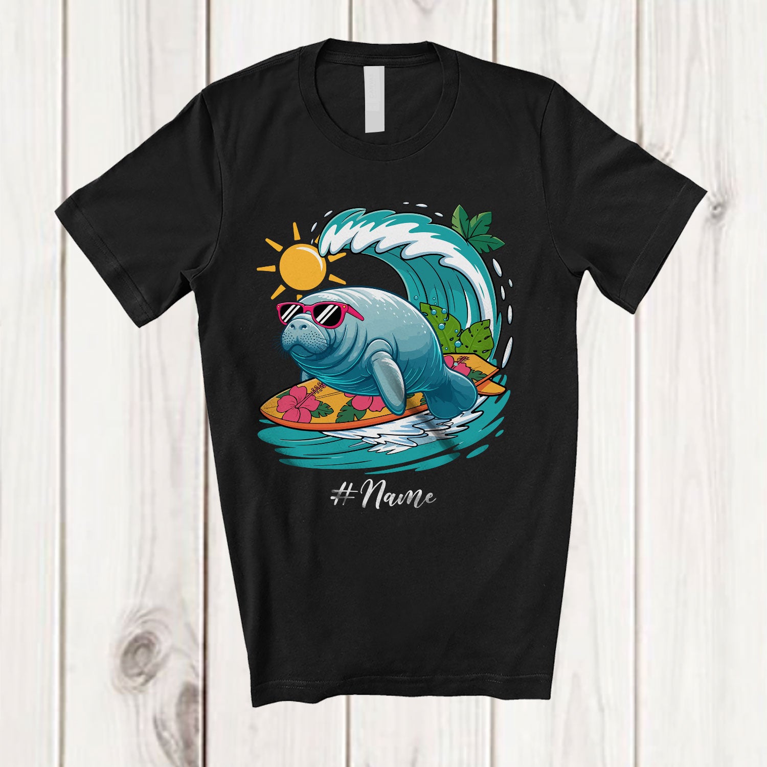 Personalized Custom Name Surfing Manatee; Amusing Summer Vacation Manatee Sea Animal T-Shirt