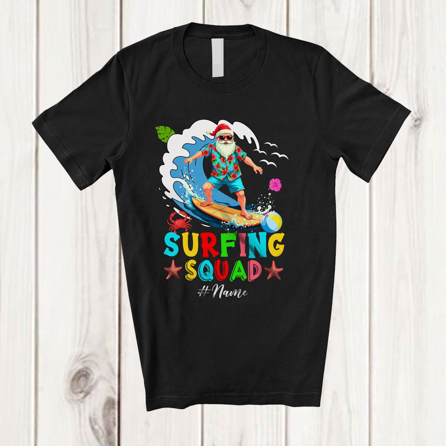 Personalized Custom Name Surfing Squad; Joyful Summer Christmas In July Santa Surfer Hawaiian T-Shirt