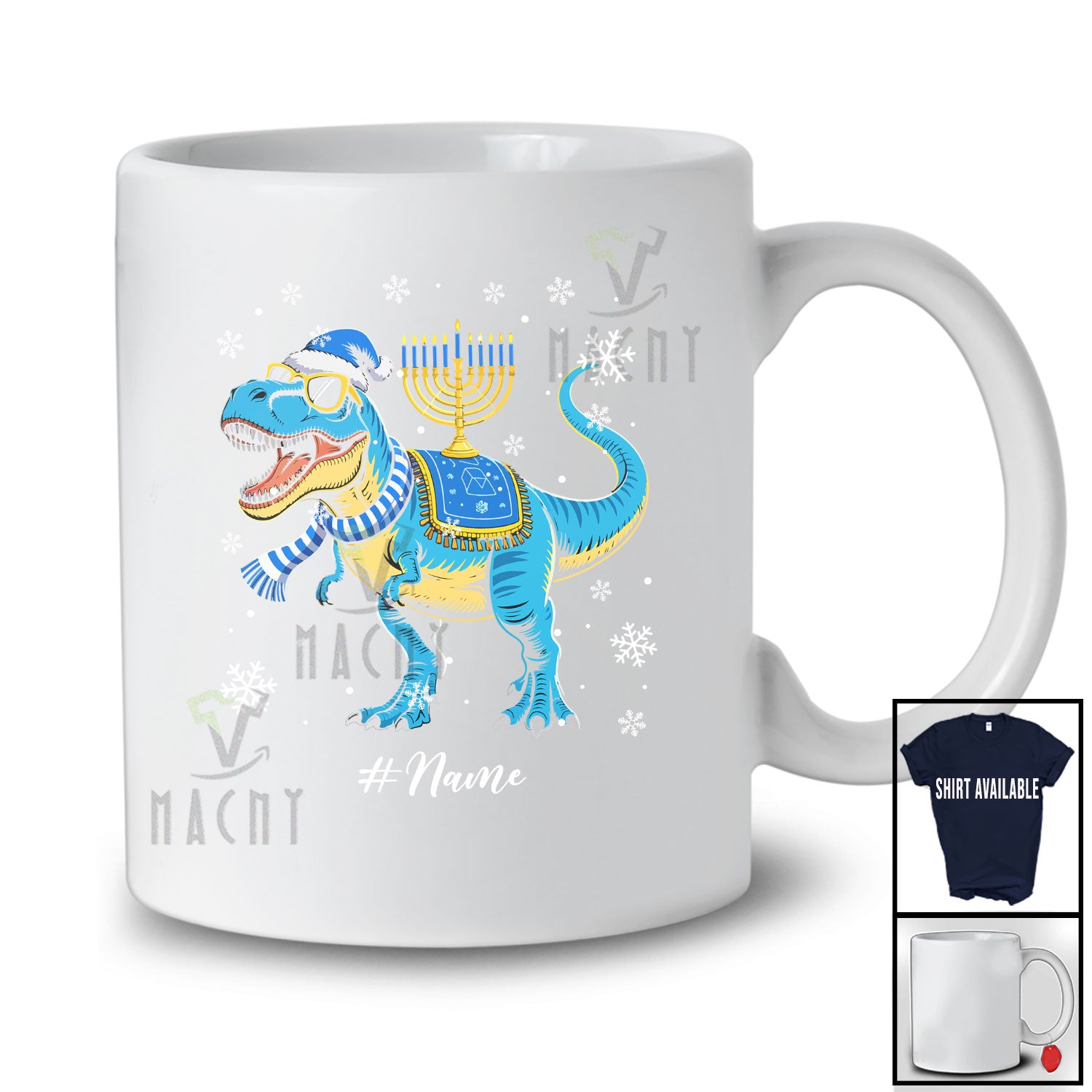 The Personalized Custom Name T-Rex Sunglasses With Hanukkah Lights; Lovely Chanukah Family T-Shirt destined to impress, and priced at only $12.95, for a limited time.