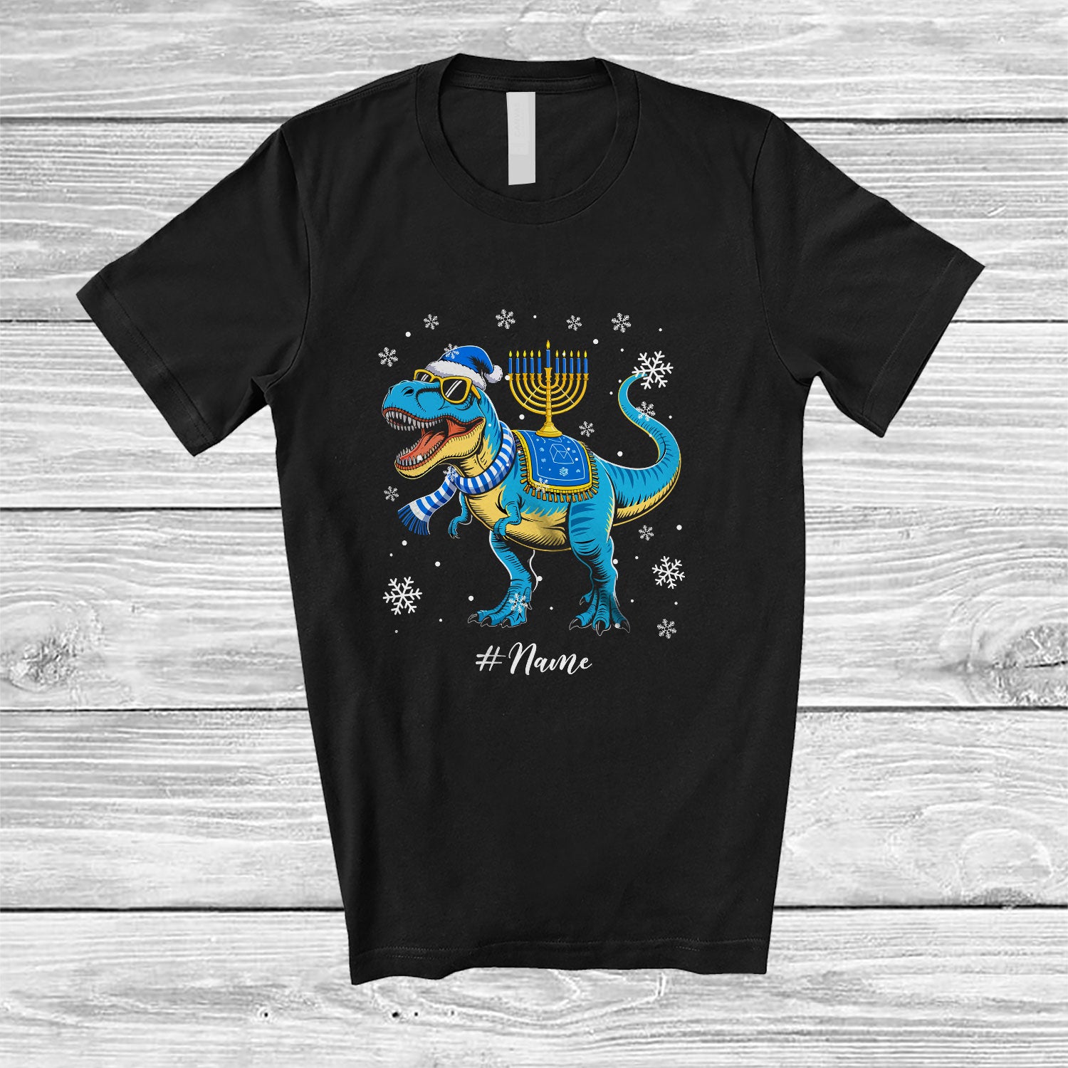 Personalized Custom Name T-Rex Sunglasses With Hanukkah Lights; Lovely Chanukah Family T-Shirt. This cotton t-shirt is a durable staple product with a classic fit. One of the most popular items, it has a relaxed style made for everyday and casual wear.