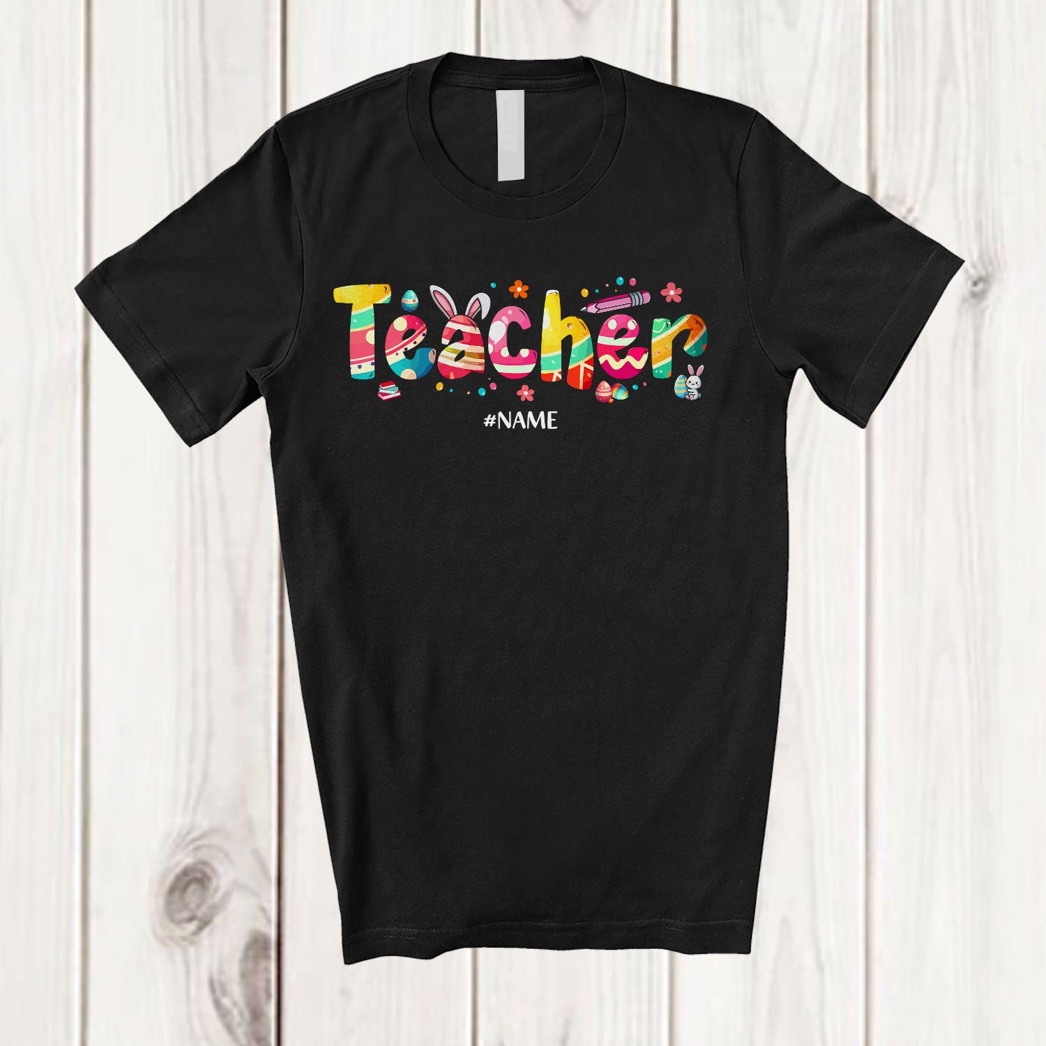 • Personalized Custom Name Teacher; Amazing Easter Bunny Eggs Hunting; Family Group T-Shirt. This cotton t-shirt is a durable staple product with a classic fit. One of the most popular items, it has a relaxed style made for everyday and casual wear.