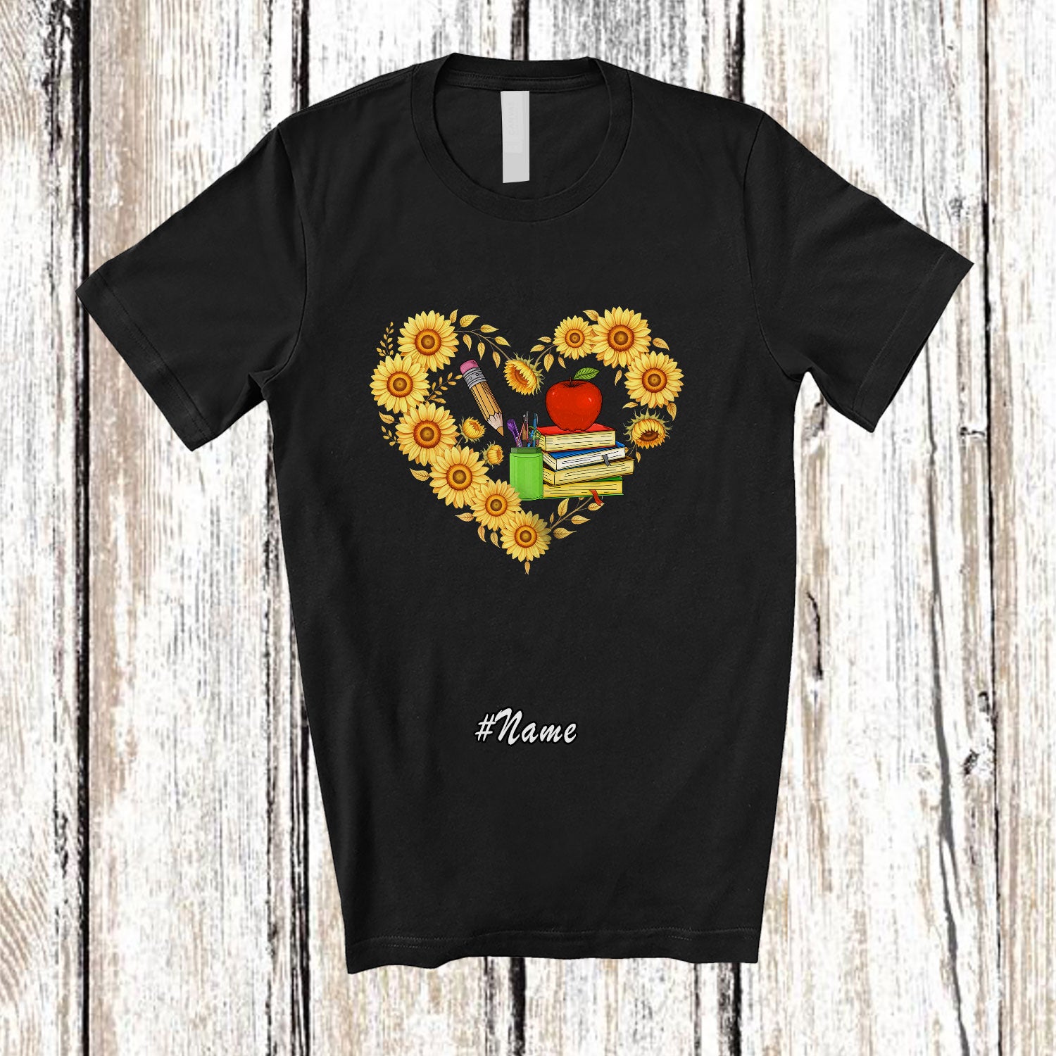 • Personalized Custom Name Teacher Tools Sunflower Heart Shape; Lovely Flowers Proud Jobs T-Shirt. This cotton t-shirt is a durable staple product with a classic fit. One of the most popular items, it has a relaxed style made for everyday and casual wear.