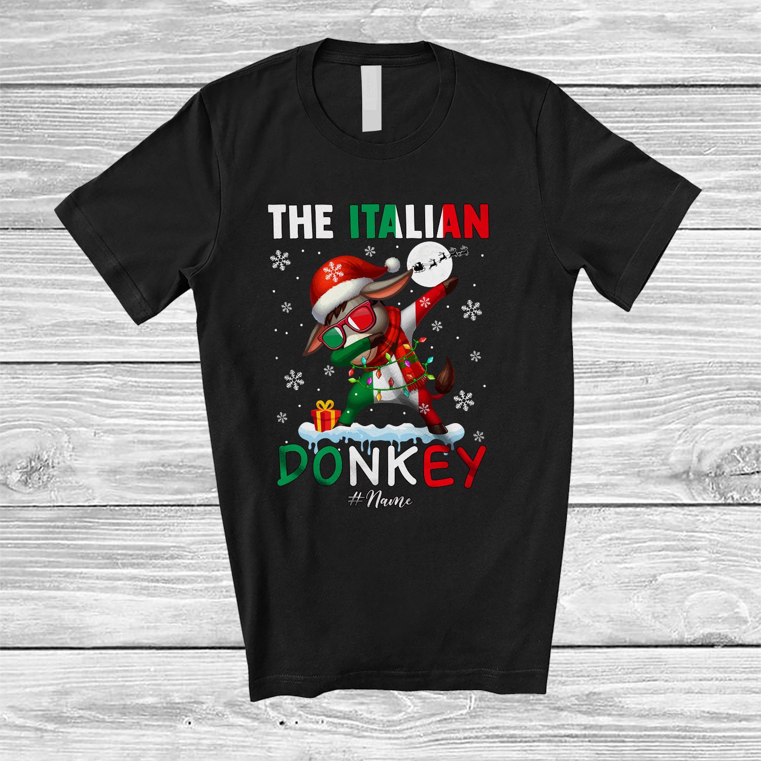 Personalized Custom Name The Italian Donkey; Cheerful Christmas Dabbing Santa Donkey; Family T-Shirt. This cotton t-shirt is a durable staple product with a classic fit. One of the most popular items, it has a relaxed style made for everyday and casual wear.