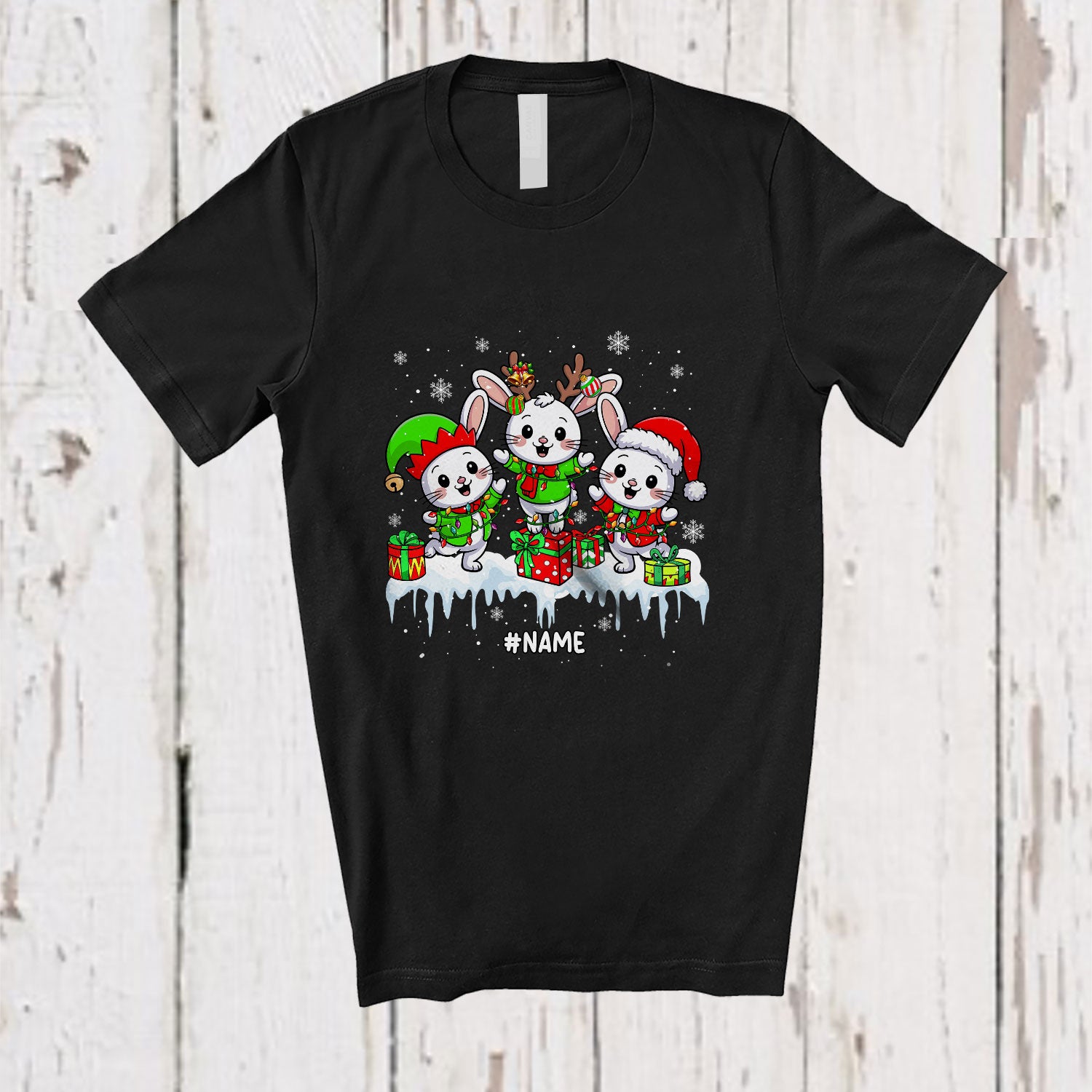 • Personalized Custom Name Three Elf Reindeer Santa Rabbits; Lovely Christmas Lights Animal T-Shirt. This cotton t-shirt is a durable staple product with a classic fit. One of the most popular items, it has a relaxed style made for everyday and casual wear.