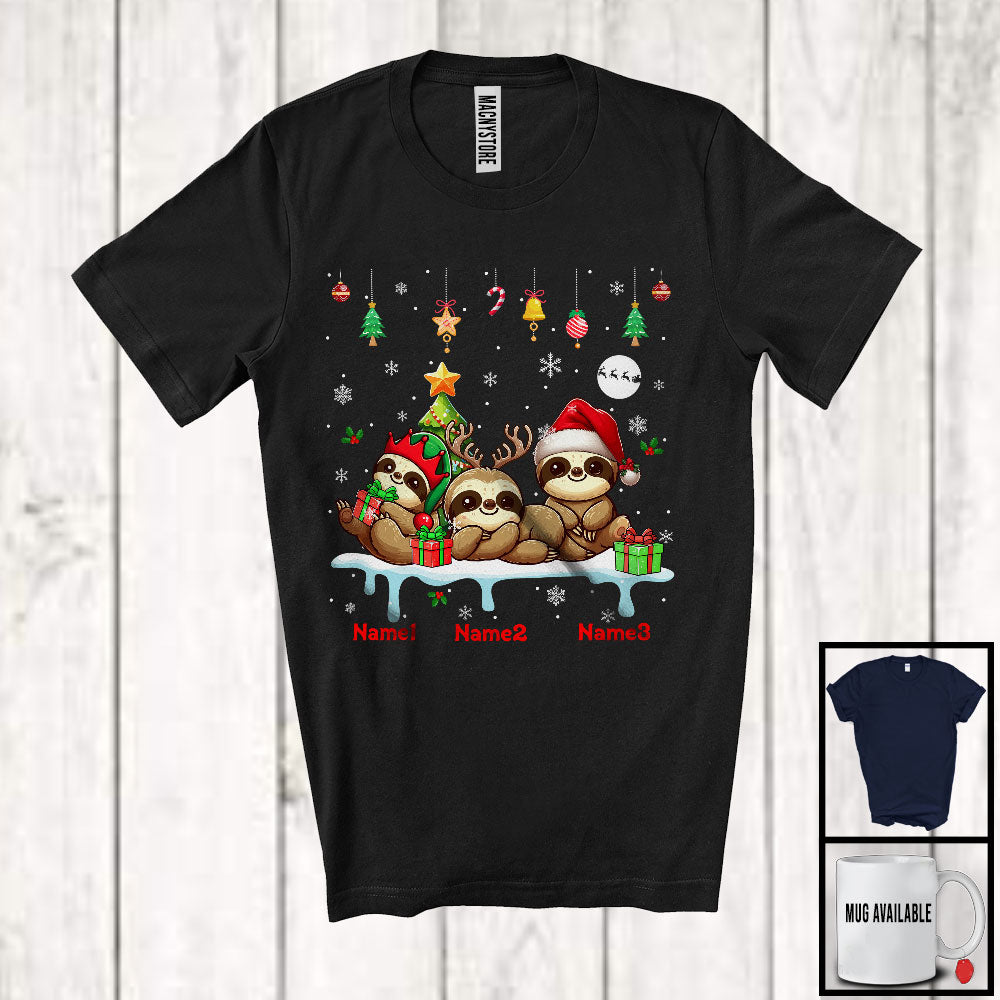 Personalized Custom Name Three Elf Santa Sloth Snowing; Joyful Christmas Tree Animal T-Shirt