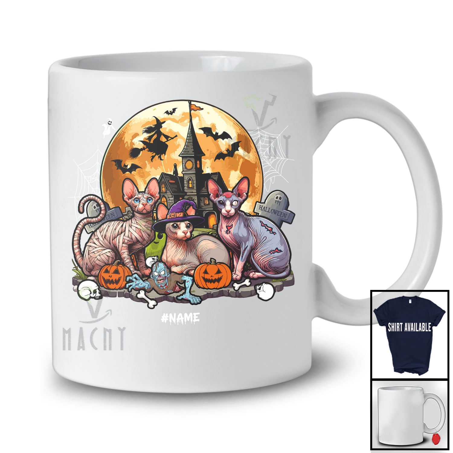 Personalized Custom Name Three Mummy Witch Zombie Sphynx Cat; Scary Halloween Moon T-Shirt. This cotton t-shirt is a durable staple product with a classic fit. One of the most popular items, it has a relaxed style made for everyday and casual wear.
