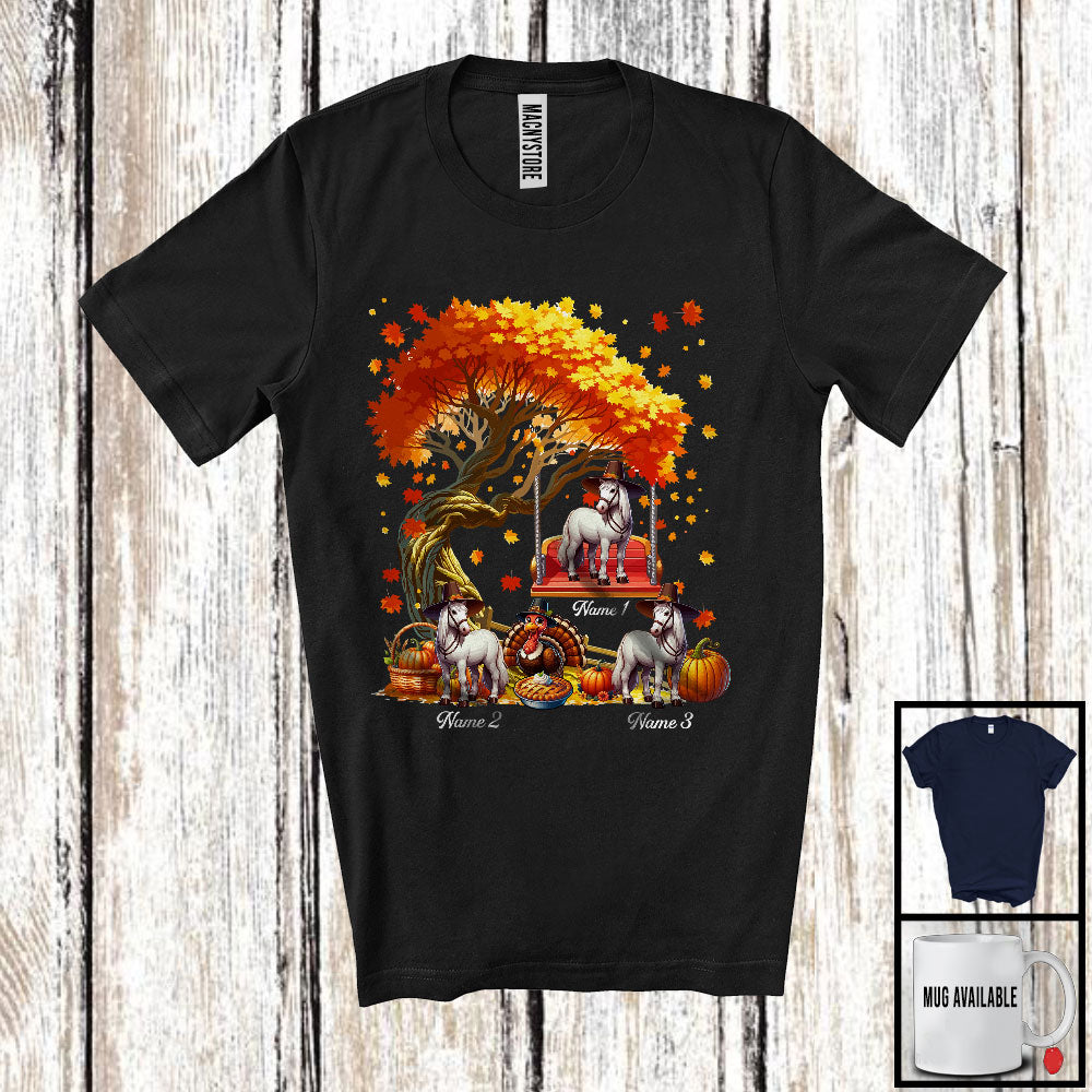 • Personalized Custom Name Three Pilgrim Horses, Happy Thanksgiving Fall Tree, Family Group T-Shirt. This cotton t-shirt is a durable staple product with a classic fit. One of the most popular items, it has a relaxed style made for everyday and casual wear.