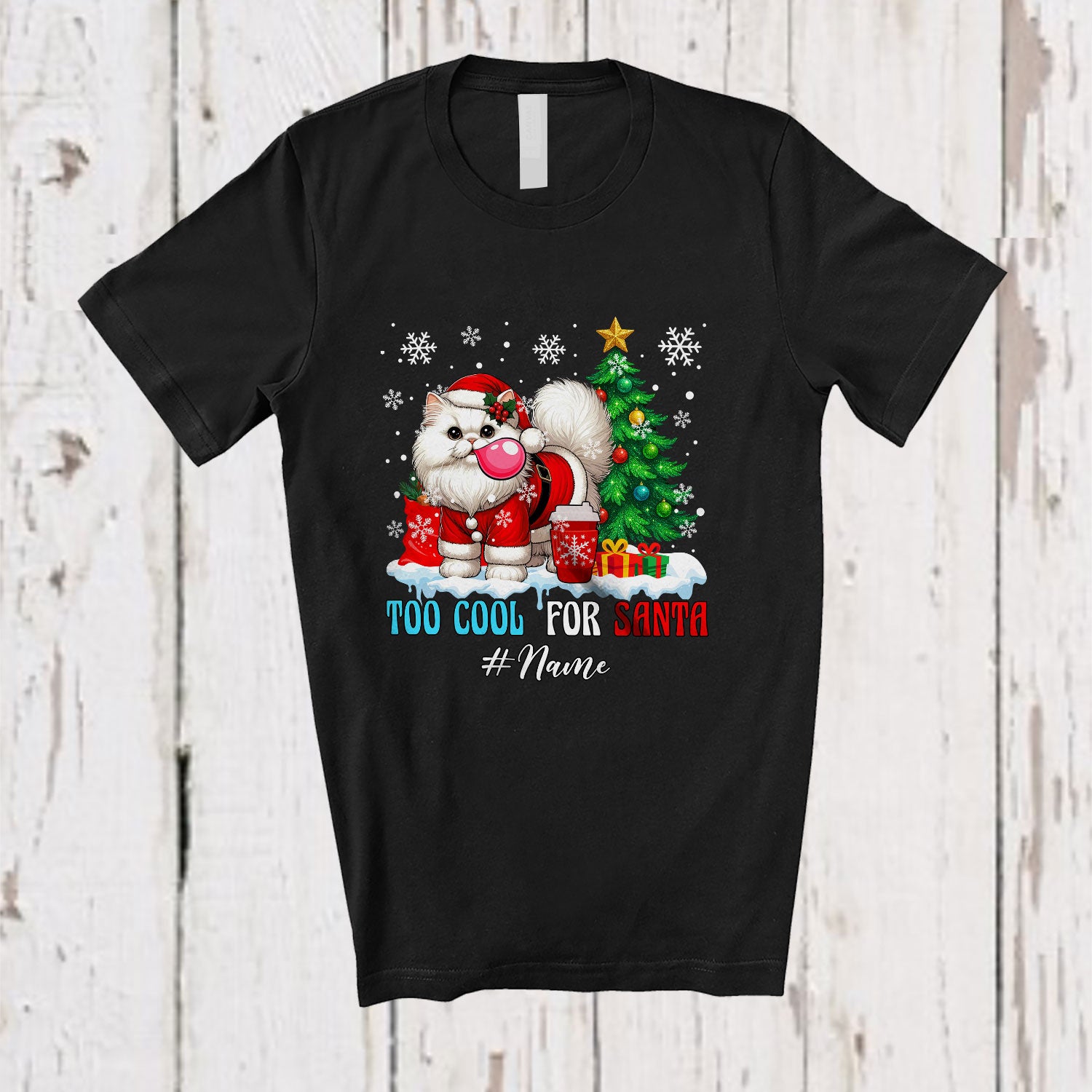 This Personalized Custom Name Too Cool For Santa; Humorous Christmas Tree Snow Cat Bubble T-Shirt is great idea gift for your family, friends in this birthday, christmas, mother's day, father's day, patrick's day or any holiday.