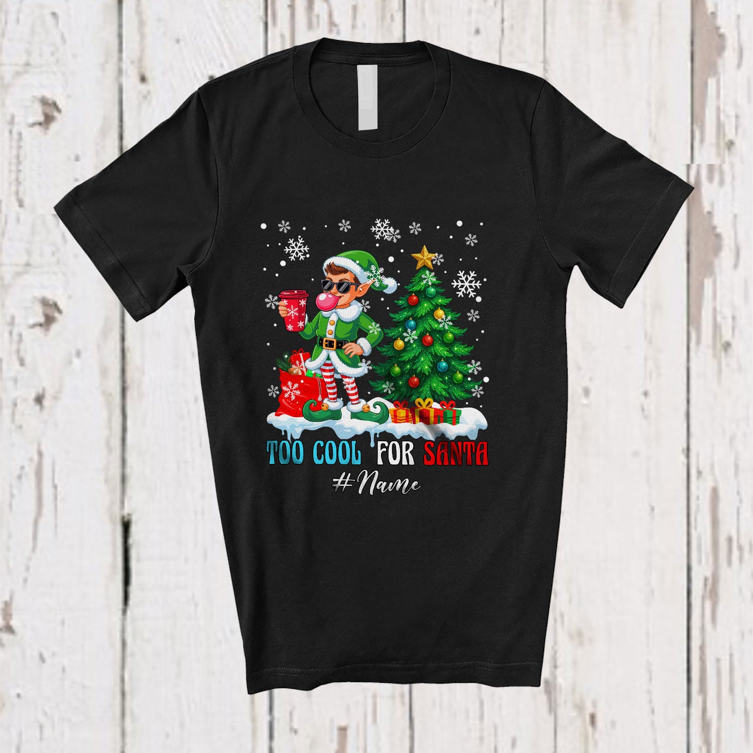 Personalized Custom Name Too Cool For Santa; Humorous Christmas Tree Snow Elf Bubble T-Shirt