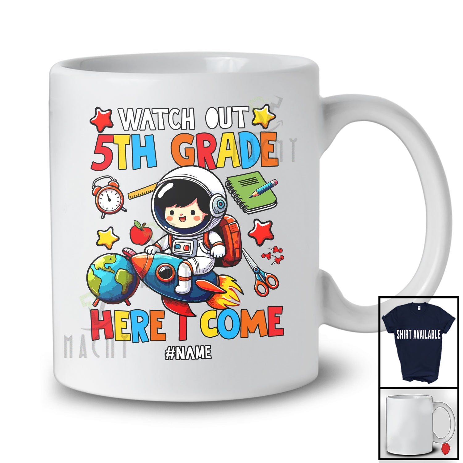 • Personalized Custom Name Watch Out 5th Grade; Joyful Back To School Astronaut Students Group T-Shirt. This cotton t-shirt is a durable staple product with a classic fit. One of the most popular items, it has a relaxed style made for everyday and casual wear.
